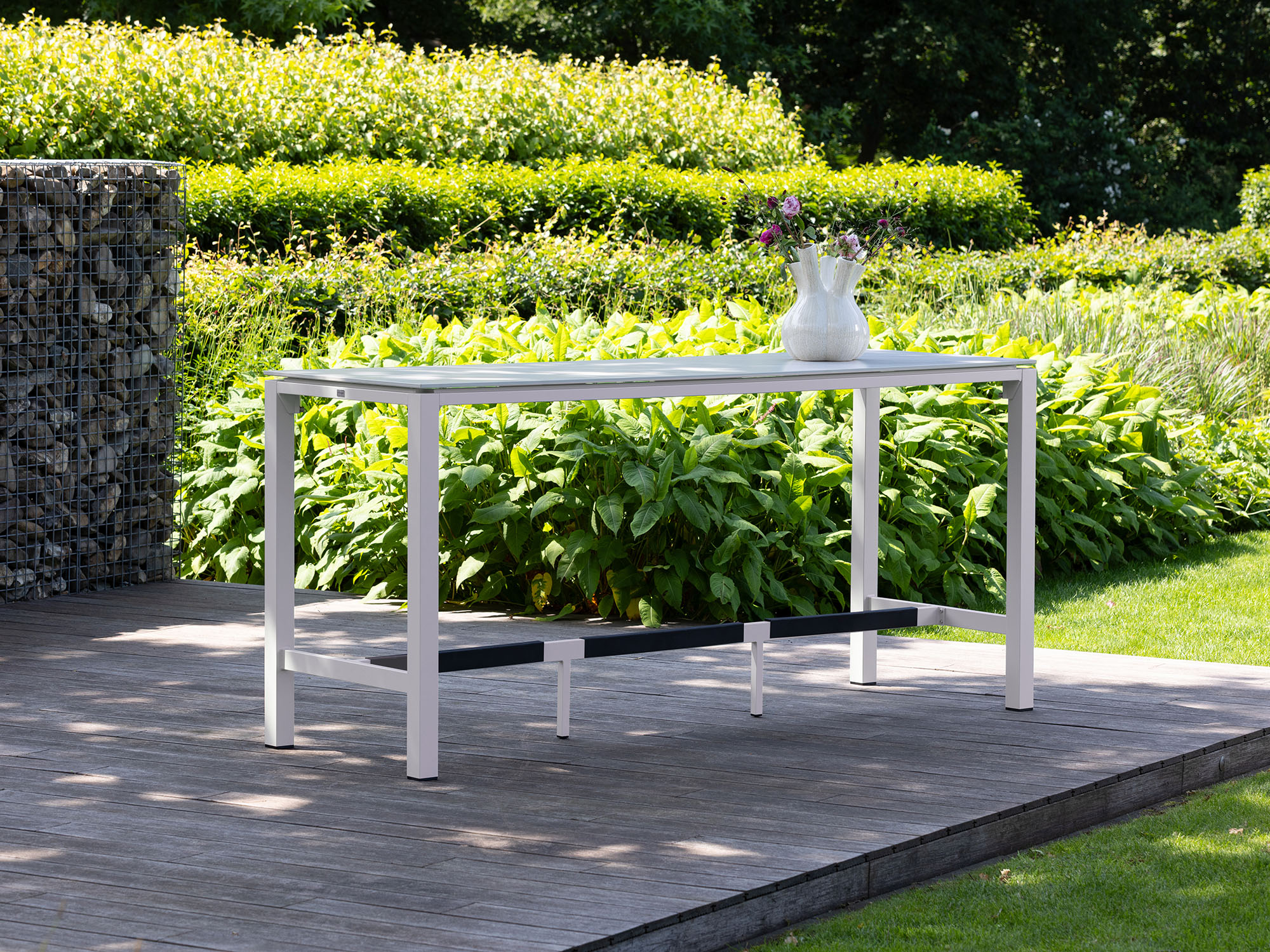 De Bellagio Trecenta bartafel is een stijlvolle en praktische toevoeging aan je tuin. Met zijn ruime afmetingen van 225x75x105 cm biedt deze bartafel plaats aan zes personen, ideaal voor gezellige borrels of een zomerse barbecue. Het tafelblad van sintered stone in de kleur Mountain White geeft een moderne en luxe uitstraling, terwijl het aluminium onderstel zorgt voor een stevige en onderhoudsarme basis. Dankzij de hoogte van de bartafel kun je er zowel aan zitten als staan, wat het een veelzijdige keuze maakt voor elke buitenruimte. Perfect voor lange avonden buiten met vrienden en familie!