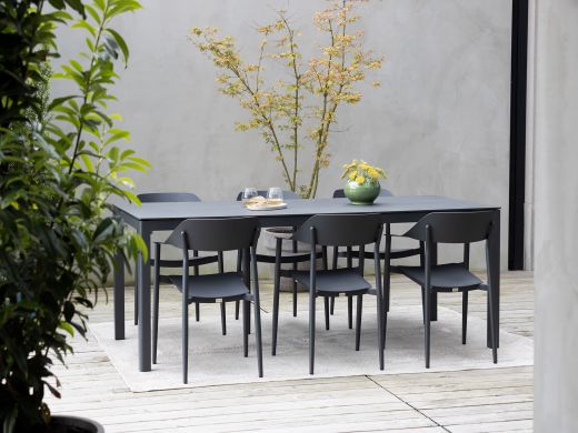 Met de Bellagio Valli/La Fonte dining tuinset haal je een stukje elegantie en comfort naar je tuin. Deze 7-delige set, uitgevoerd in stijlvol antraciet, biedt plaats aan zes personen en is ideaal voor lange zomeravonden met vrienden of familie. Het tafelblad van HPL met een natuurlijke leisteenlook is niet alleen een lust voor het oog, maar ook kras- en vlekbestendig. De aluminium frames van de stoelen en tafel zorgen ervoor dat je je geen zorgen hoeft te maken over roest, zelfs niet na een flinke regenbui. Zo kun je je volledig richten op wat echt belangrijk is: genieten van het buitenleven.
