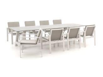 Met de Bellagio Vezzano/Bresimo dining tuinset haal je een stukje luxe naar je eigen tuin. Deze 9-delige set, uitgevoerd in stijlvol wit, biedt comfortabel plaats aan acht personen. Ideaal voor lange zomeravonden met vrienden of familie. Het Dekton Soke tafelblad is niet alleen een lust voor het oog, maar ook praktisch: het is kleur- en hittebestendig en vraagt nauwelijks onderhoud. De stoelen zijn voorzien van textileen zittingen die zich naar je lichaam vormen, zodat je urenlang comfortabel kunt tafelen. En dankzij het stevige aluminium frame hoef je je geen zorgen te maken over roest of wiebelende stoelen. Zo kun je je volledig richten op wat echt belangrijk is: genieten van het buitenleven.