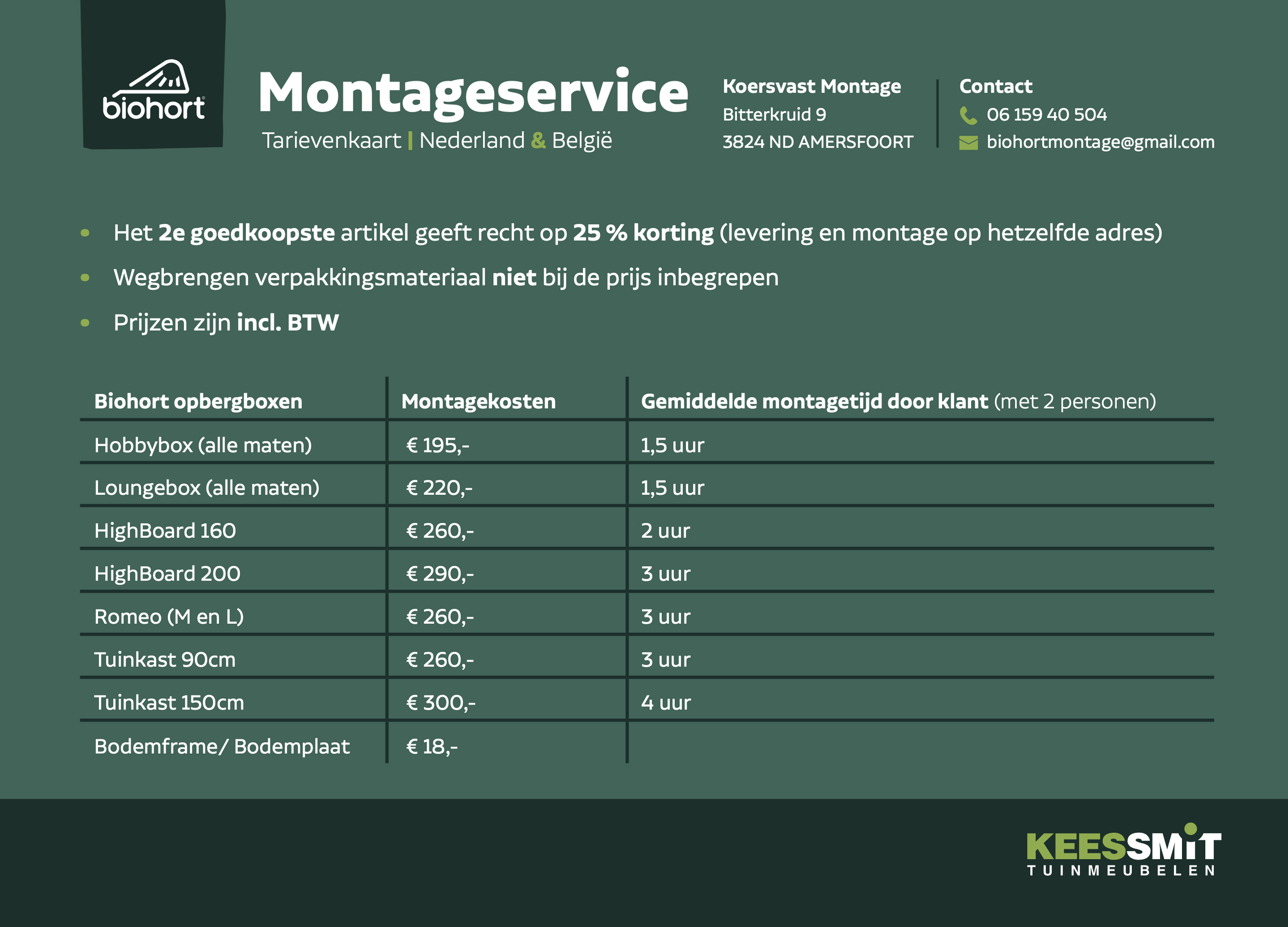 Maandag 10:00 - 17:00 uur Dinsdag Gesloten Woensdag 10:00 - 17:00 uur Donderdag 10:00 - 17:00 uur Vrijdag 10:00 - 17:00 uur Zaterdag 10:00 - 17:00 uur Zondag Gesloten Speciale openingstijden