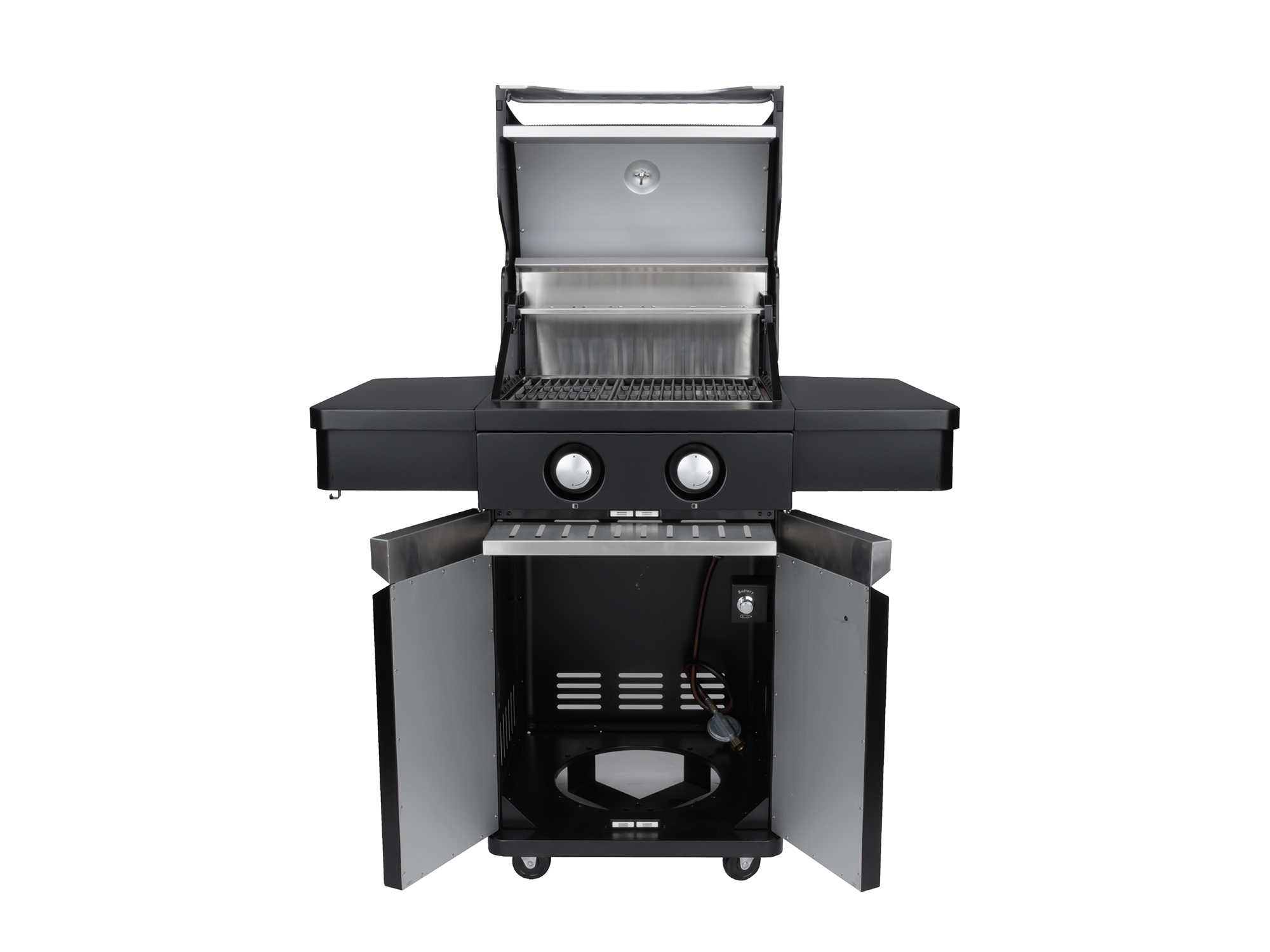 Onder de barbecue vind je een kast met dubbele deur waarin je je gasfles en accessoires netjes kunt opbergen. Boven het grillrooster zit een warmhoudrek en een luxe RVS warmhoudplaat, handig om gegrilde gerechten warm te houden terwijl je de rest afmaakt. Zo staat niet alles tegelijk op het rooster en houd je meer overzicht.