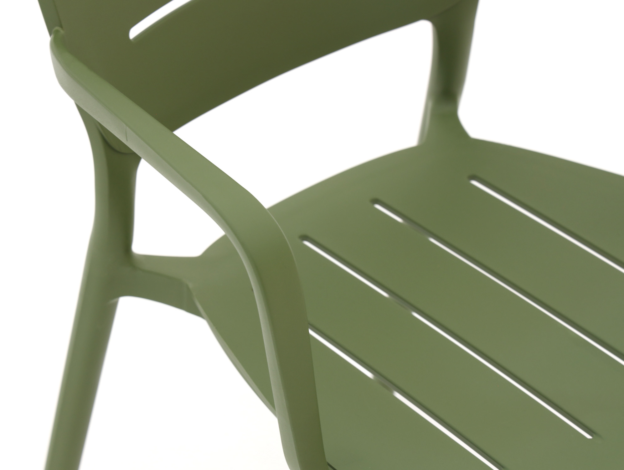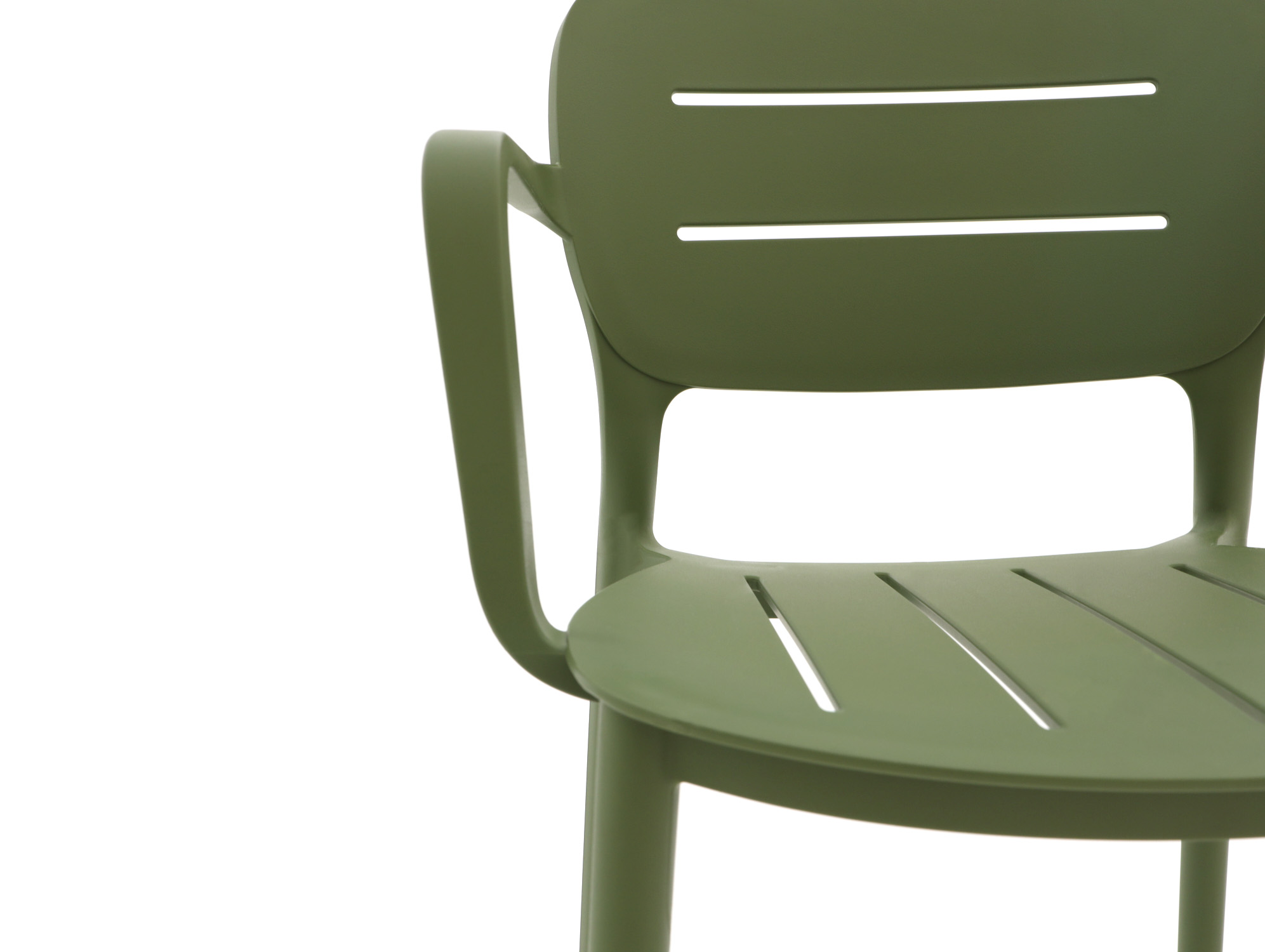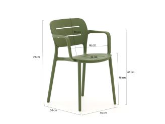 Kunststof zitting en frame: Lichtgewicht en UV-bestendig, waardoor de stoelen hun kleur behouden en makkelijk te verplaatsen zijn. Perfect voor als je de opstelling regelmatig wilt veranderen.