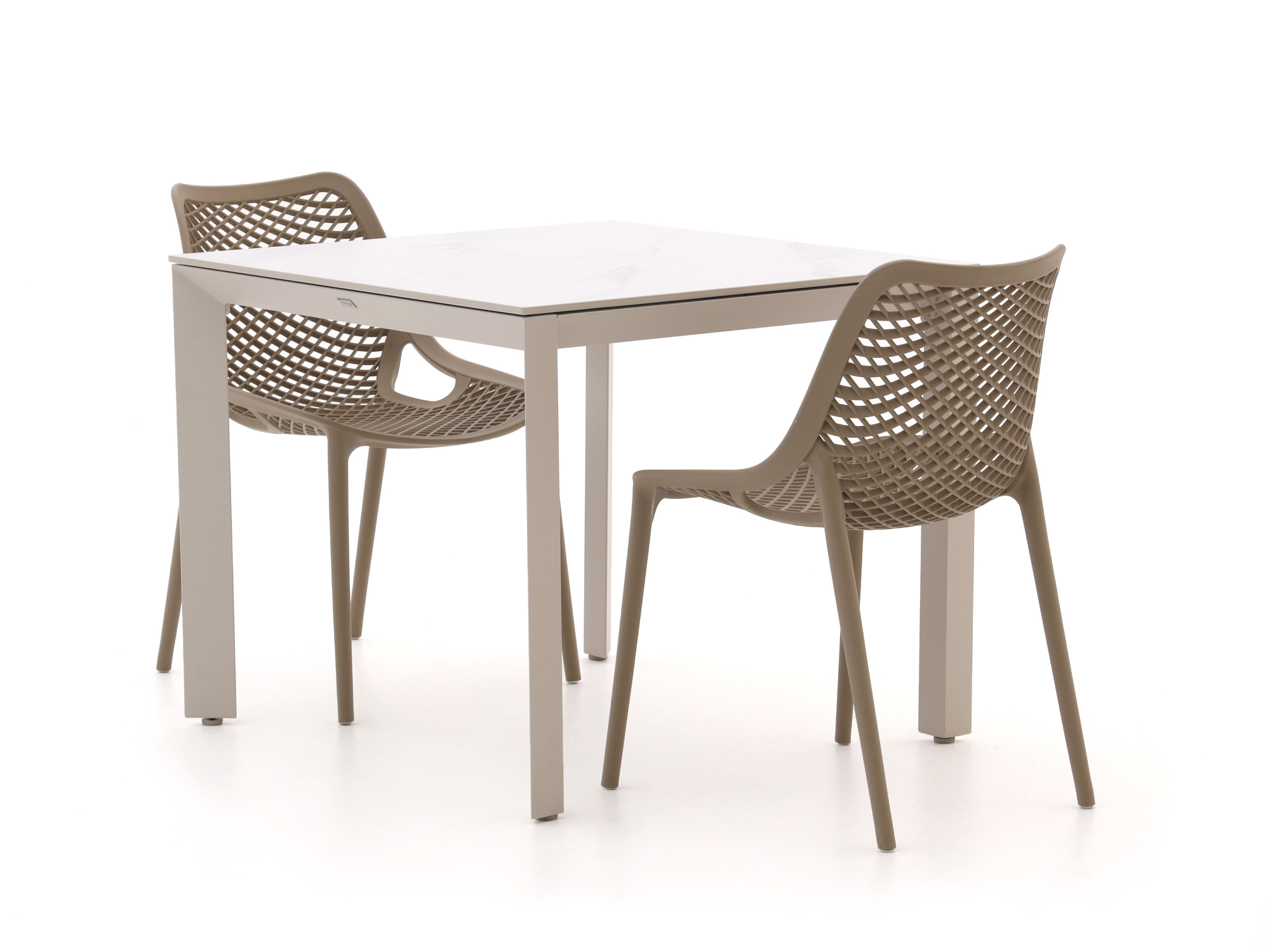 Ontdek de charme van de Forza Ripi/Sestino dining tuinset, een compacte en stijlvolle keuze voor je tuin of balkon. Deze set is perfect voor een intiem diner of een gezellige koffiepauze met z'n tweeën. Het tafelblad van sintered stone in de kleur Mountain White is niet alleen een lust voor het oog, maar ook bestand tegen krassen en vlekken. De kunststof stoelen zijn licht en stapelbaar, wat het verplaatsen en opbergen een fluitje van een cent maakt. Een slimme keuze voor wie houdt van gemak en elegantie in de buitenlucht!