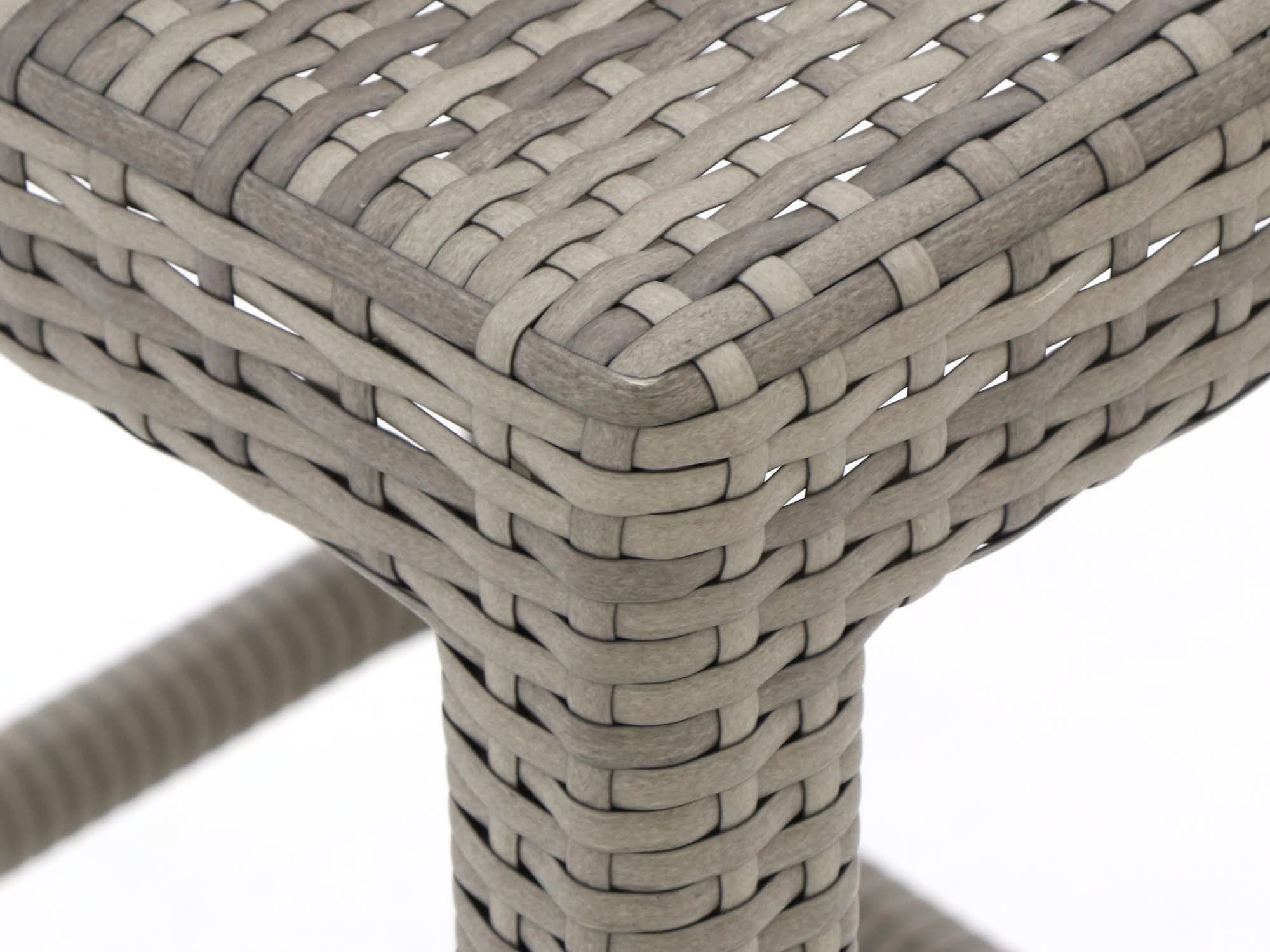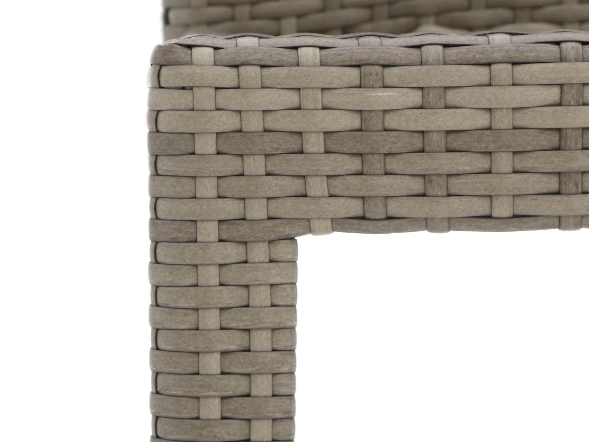 Handgevlochten wicker stoelen: Vochtbestendig en licht van gewicht, waardoor ze makkelijk te verplaatsen zijn. Bovendien blijven ze netjes zonder loshangende draden.