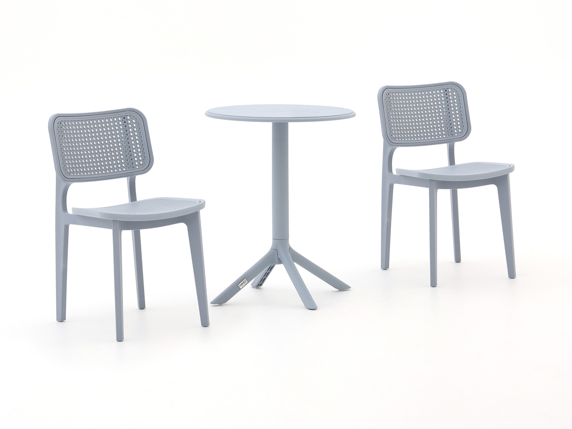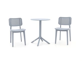 De Forza Xitta/Rieti balkonset is een compacte ronde set voor 2 personen, ideaal als je een kleiner balkon of terras hebt maar wel lekker buiten wilt zitten. De ronde kunststof tafel van 60 cm doorsnee neemt weinig ruimte in, terwijl je toch prima een ontbijtje, laptop of borrelhapjes kwijt kunt. De stoelframes zijn van aluminium, dus licht van gewicht en makkelijk te verschuiven als je de zon in wilt draaien. Dankzij het kunststof tafelblad kun je alles zo afnemen, handig als er eens wat omgaat.