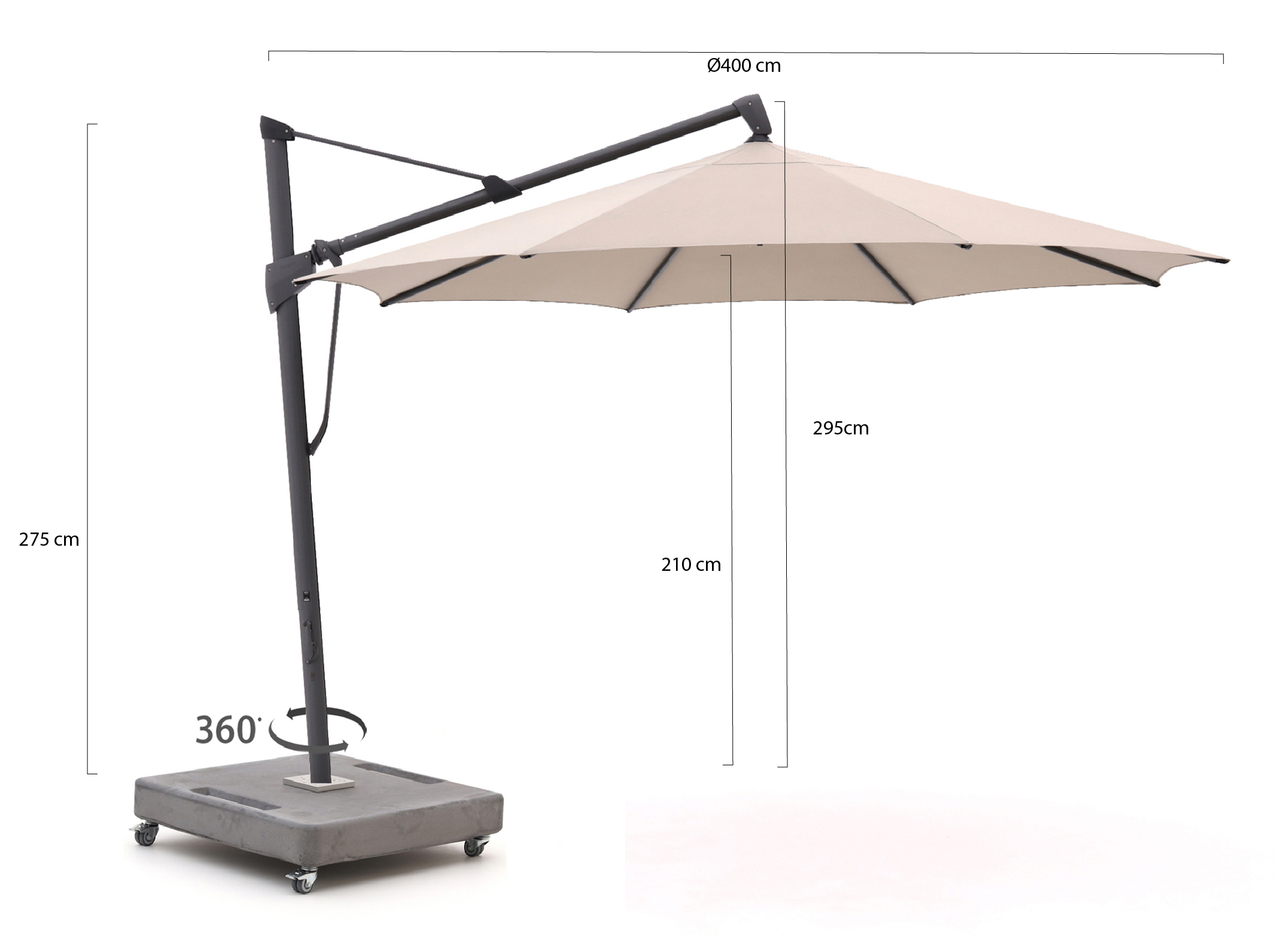 Je draait de parasol in 360 graden makkelijk met de zon mee. Zo zit je de hele dag lekker in de schaduw, zonder je stoel te verplaatsen.