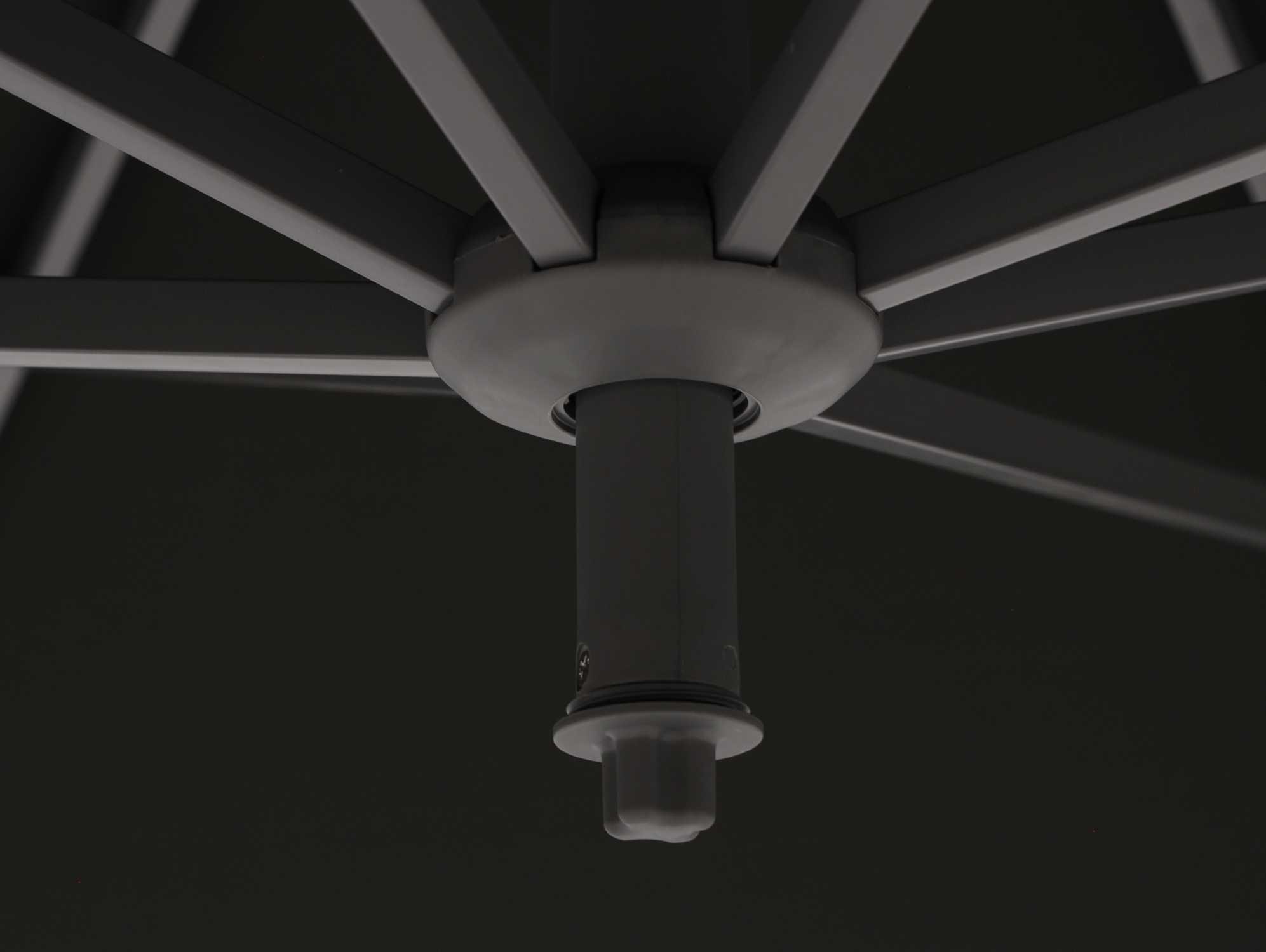 Dankzij de zwevende constructie zit er niks in de weg. Je hebt alle ruimte onder het doek, ideaal bij een eettafel of loungeset.