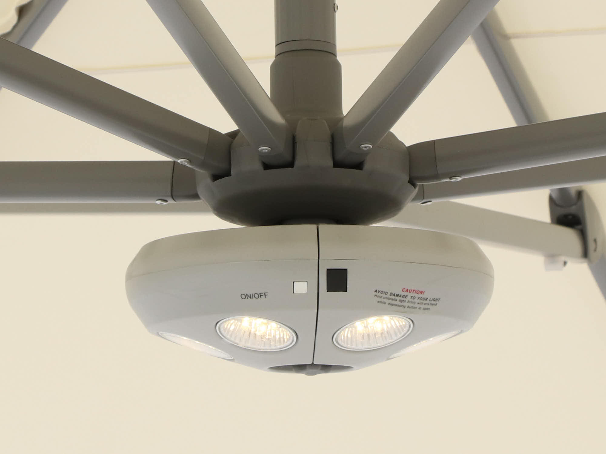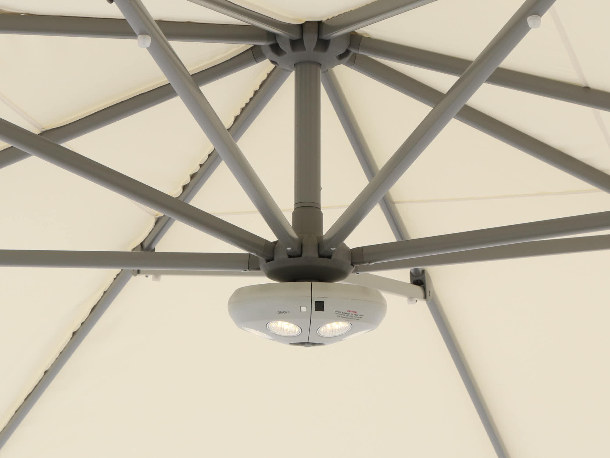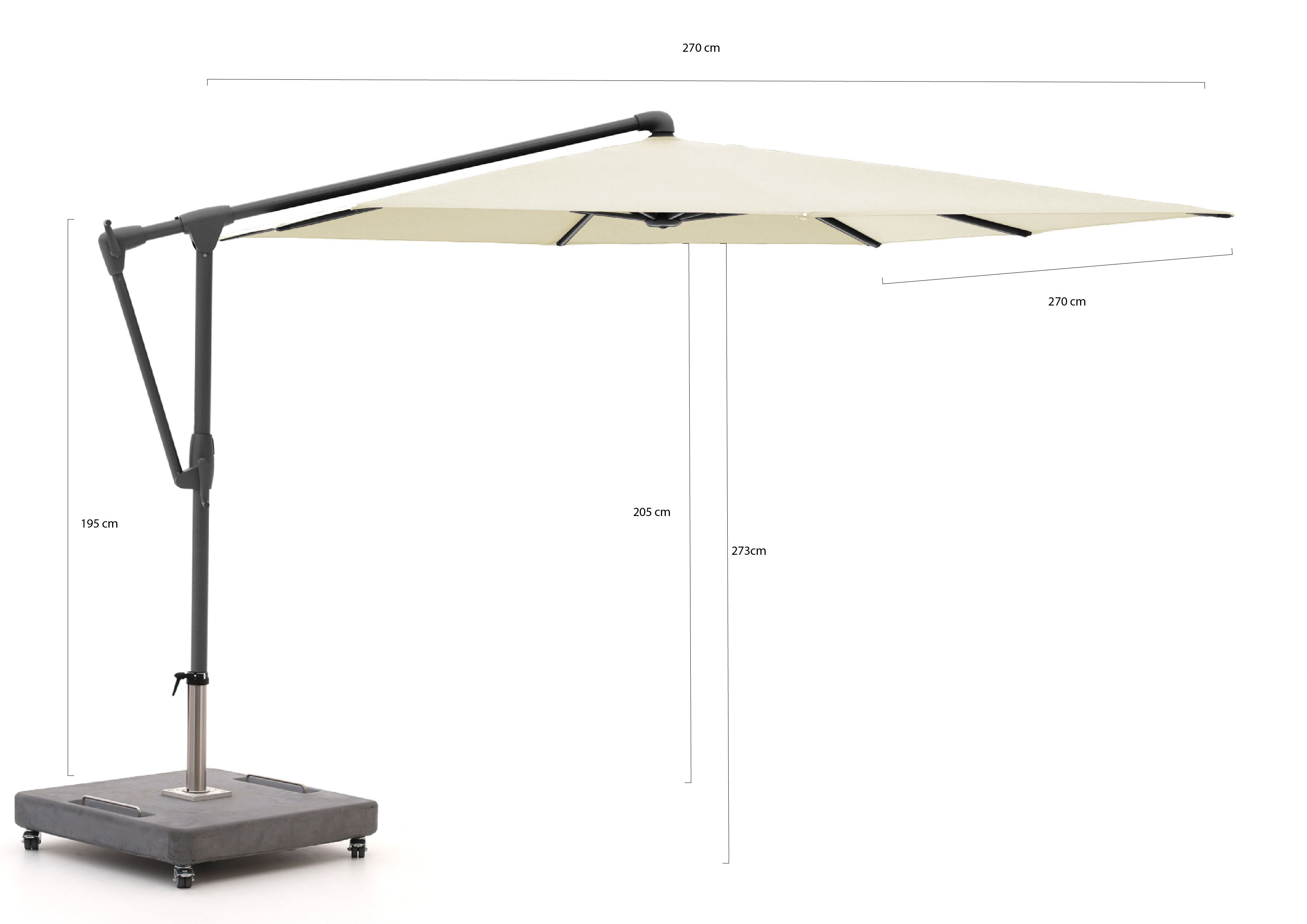 Dankzij de zwevende constructie zit er niks in de weg. Je hebt alle ruimte onder het doek, ideaal bij een eettafel of loungeset.