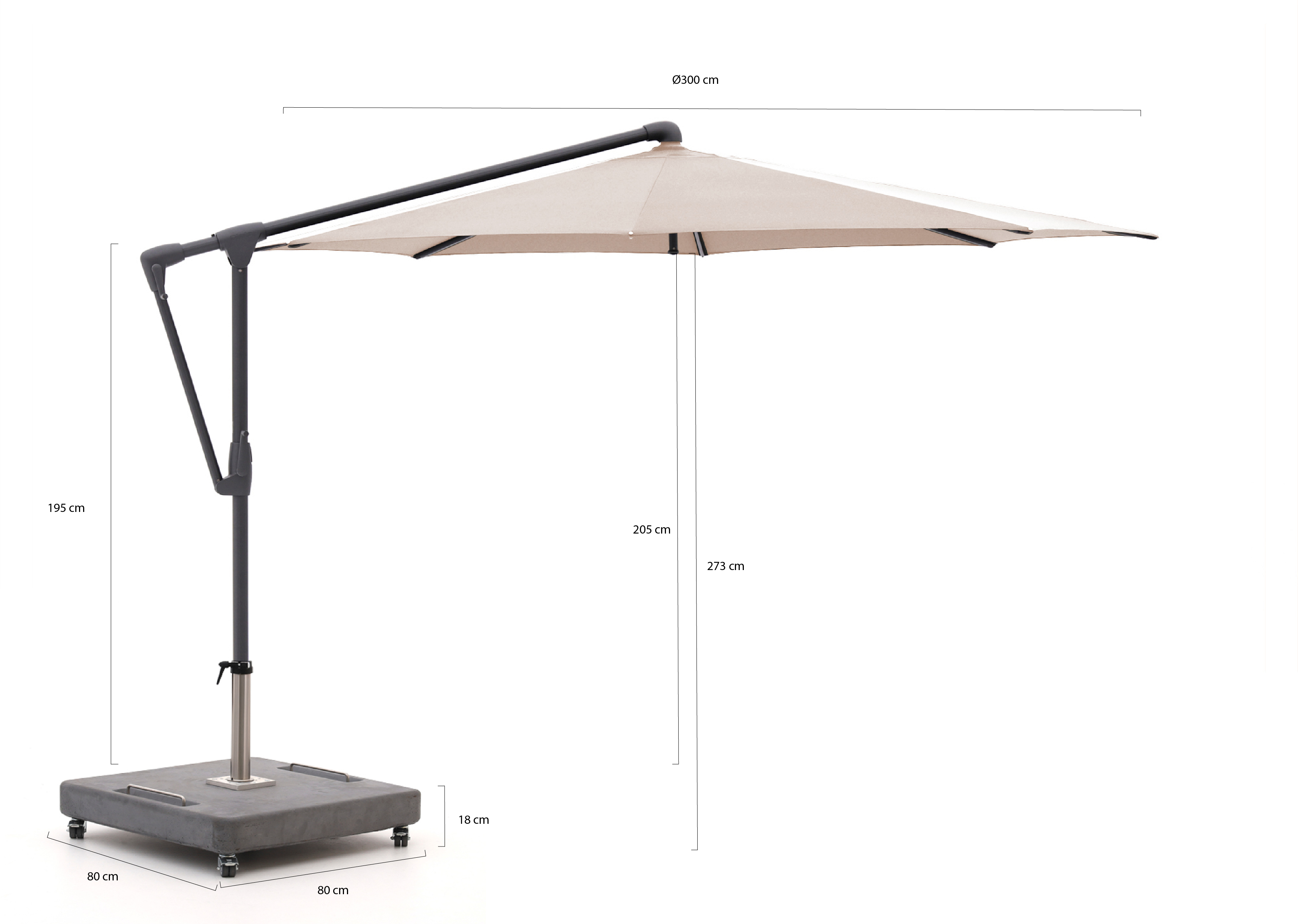 • Inclusief verrijdbare voet van 160 kg: De zware voet zorgt dat de parasol stevig blijft staan, terwijl je ‘m toch kunt verplaatsen als je je terrasindeling wilt veranderen.