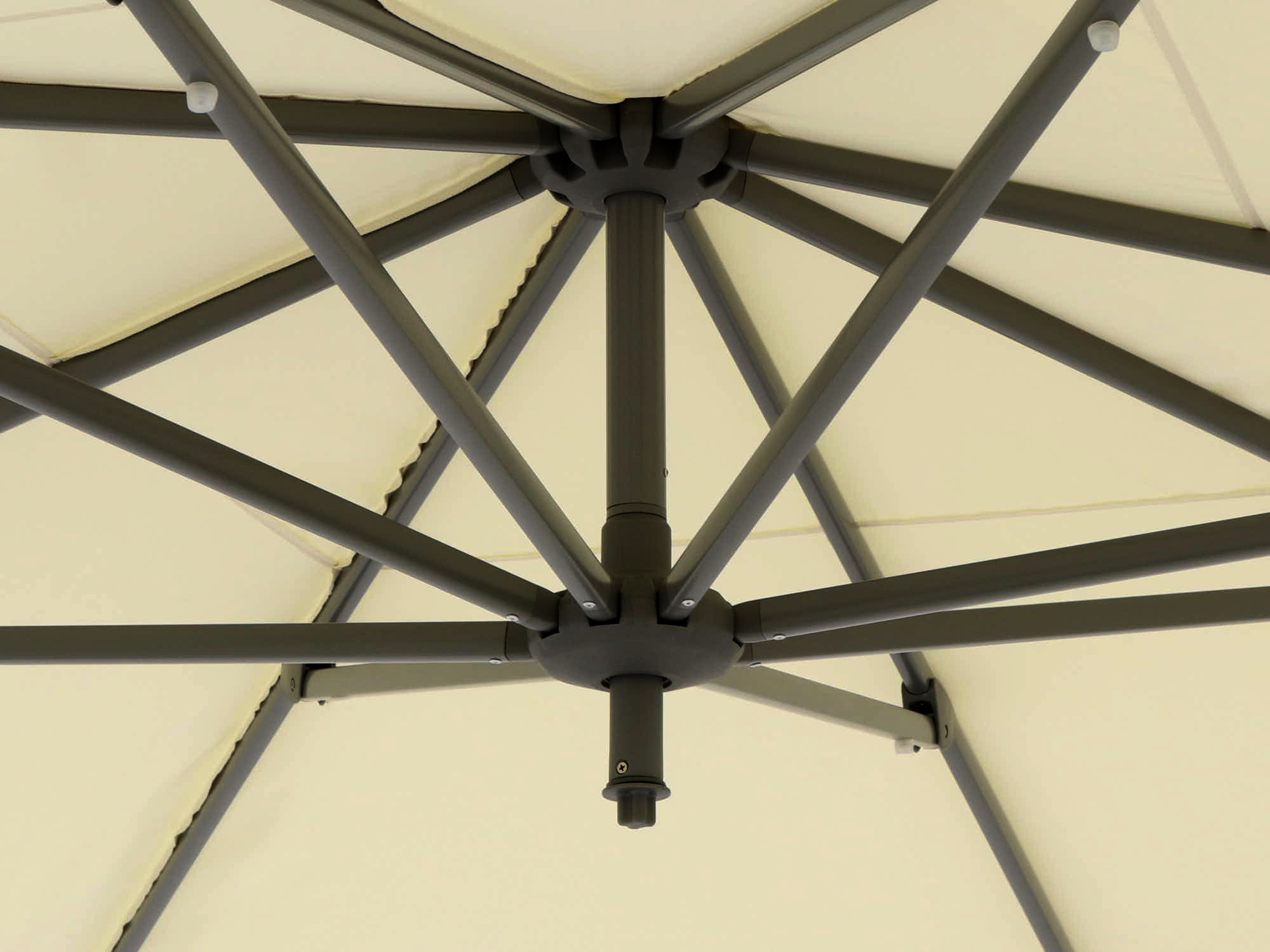 Dankzij de zwevende constructie zit er niks in de weg. Je hebt alle ruimte onder het doek, ideaal bij een eettafel of loungeset.