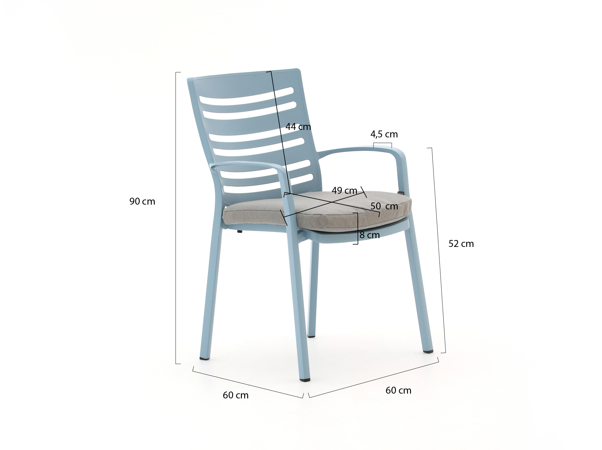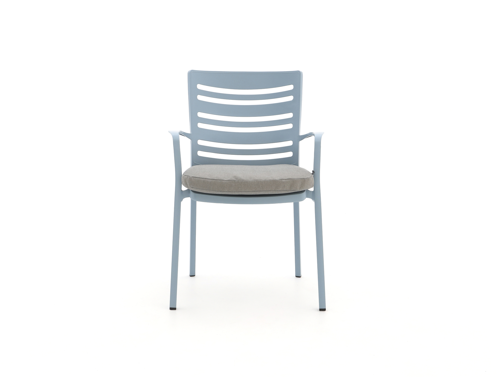 De Hartman Alexandra dining tuinstoel blauw is een tuinstoel voor wie graag lang en rechtop aan tafel zit, met net wat extra zitcomfort door het meegeleverde grijze kussen. De stoel is stapelbaar, dus gebruik je meerdere stoelen, dan schuif je ze na het eten zo op elkaar en houd je jouw terras lekker ruim. Het aluminium frame is licht en kan niet doorroesten, waardoor je de stoel makkelijk verplaatst en hij prima buiten kan staan. De kunststof zitting is stevig, vormvast en heeft weinig onderhoud nodig, ideaal als je gewoon wilt gaan zitten zonder gedoe.