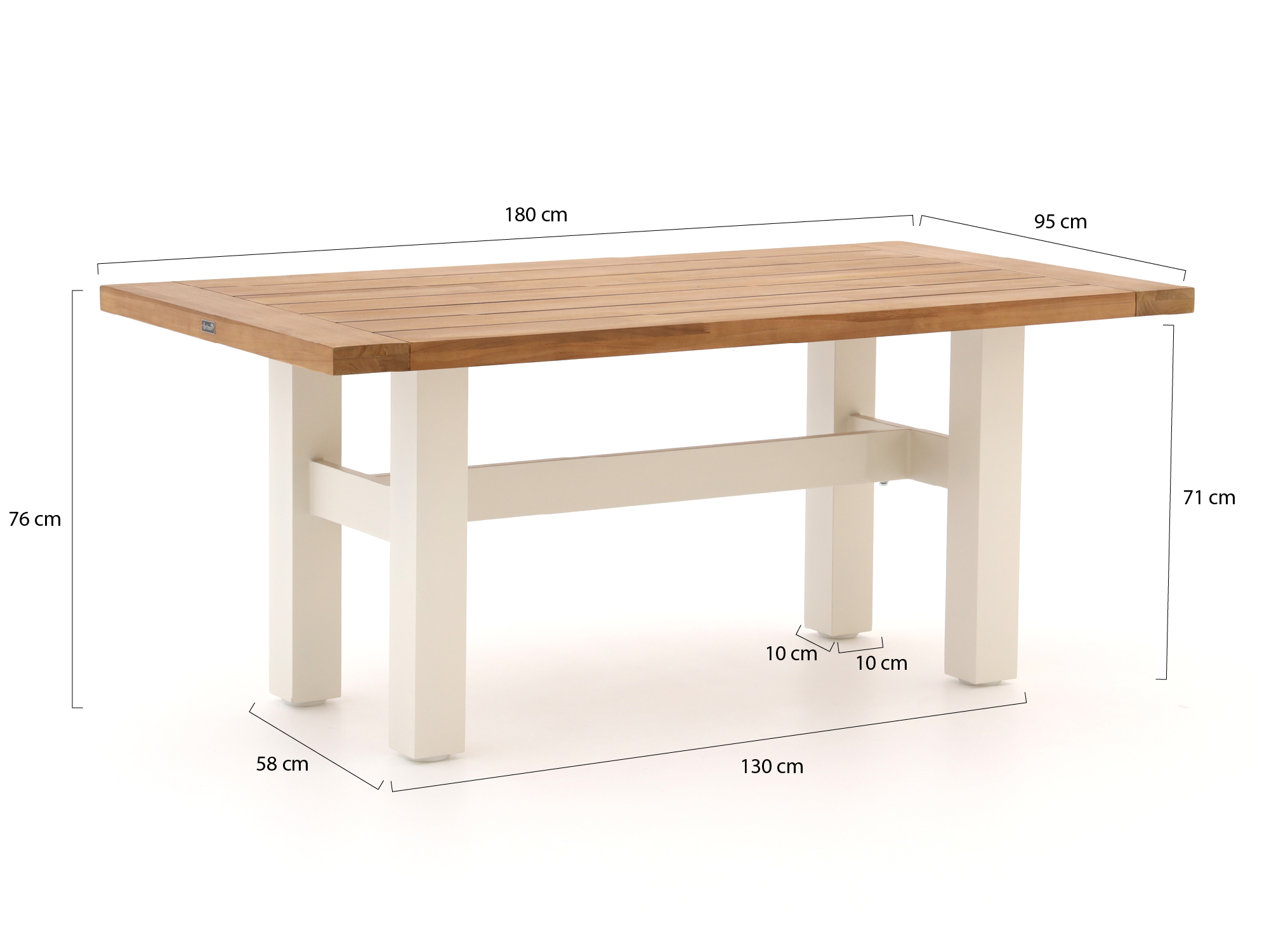 • Teakhouten tafelblad: Sterk natuurproduct dat tegen alle weersomstandigheden kan, zodat je zorgeloos een seizoen buiten kunt laten staan.