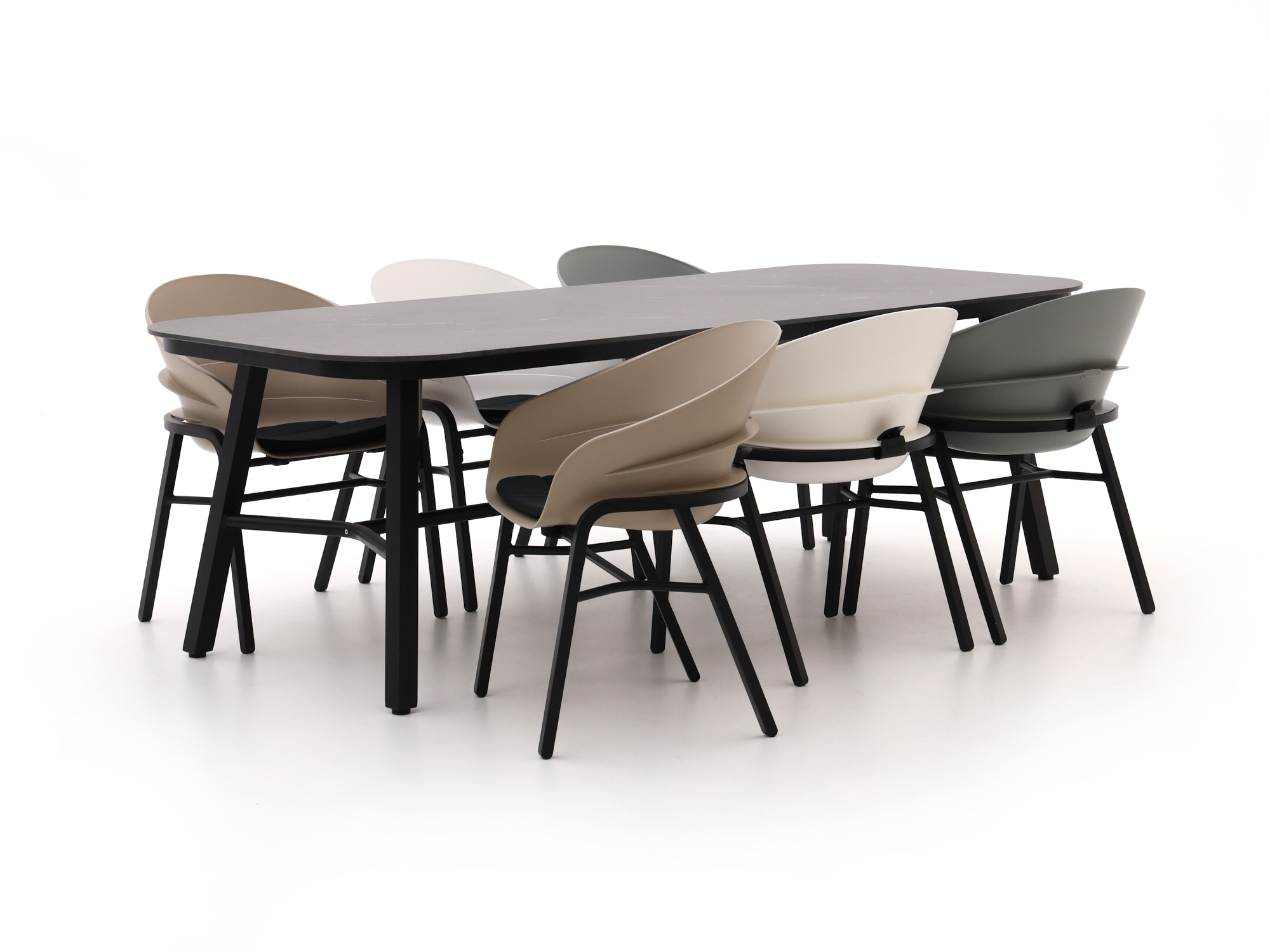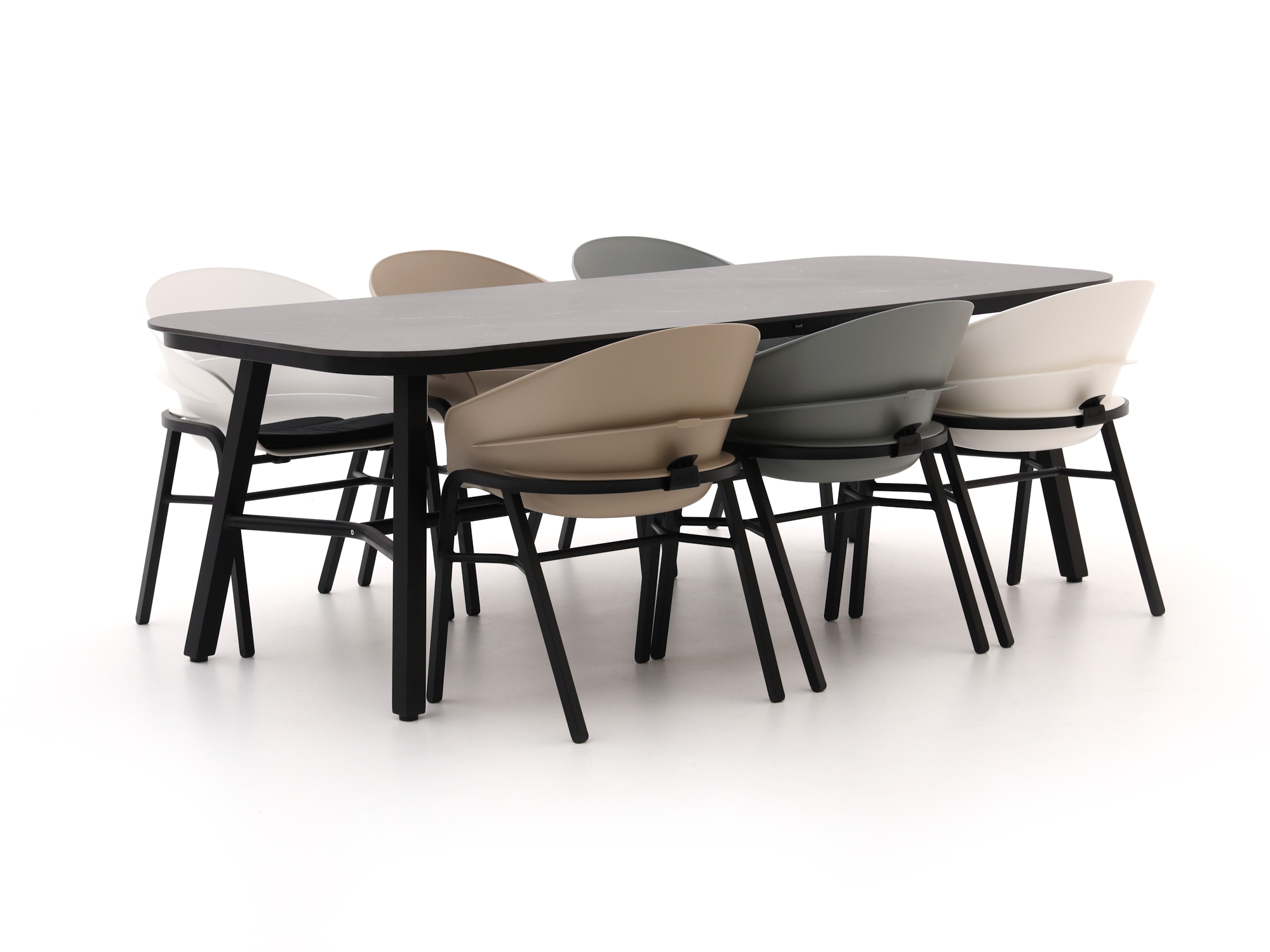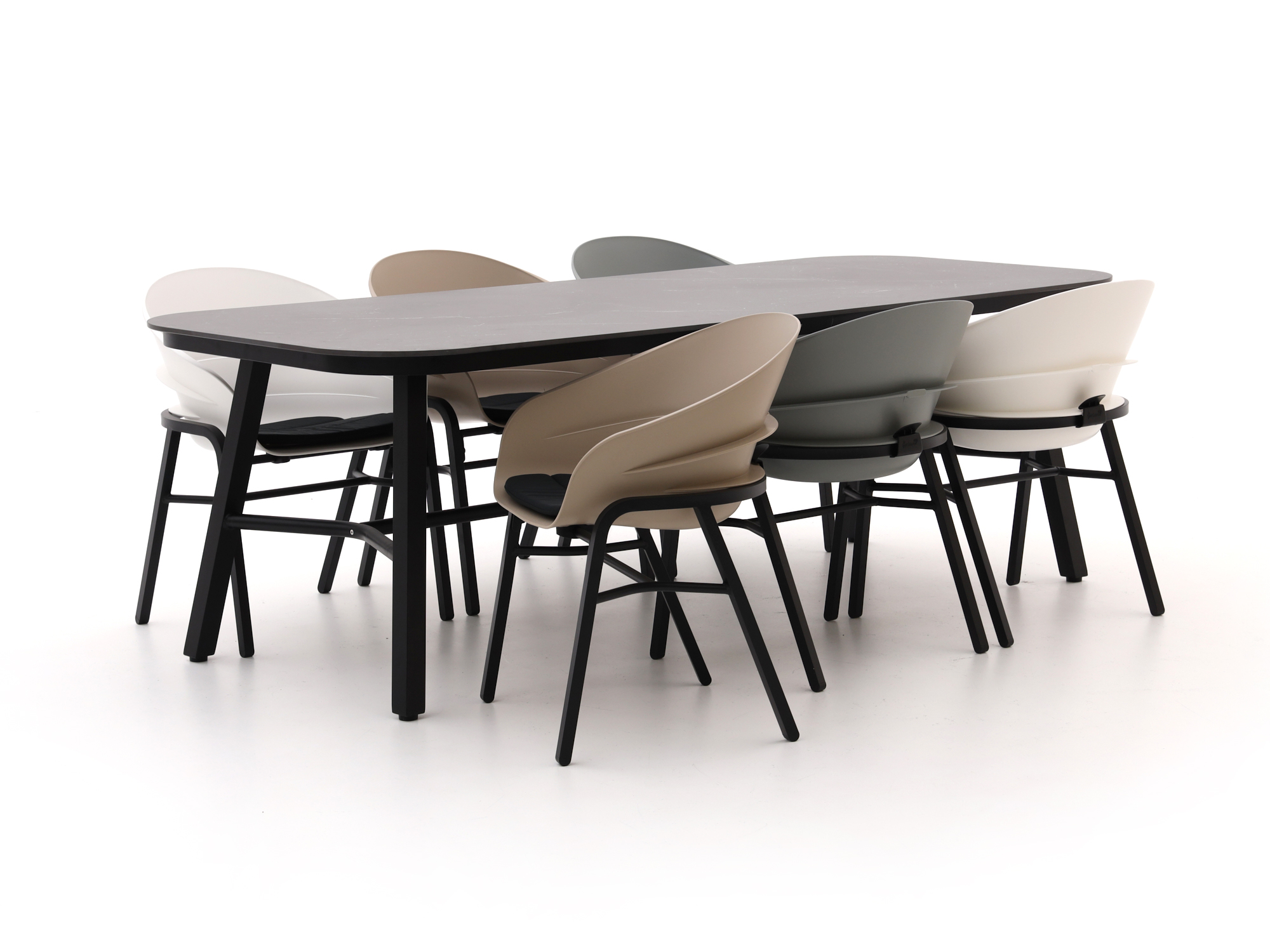 Dit is zo’n set waar je automatisch langer blijft zitten. Je eet met z’n zessen aan de 240 cm tafel en klapt daarna de stoelen wat naar achter voor de koffie. De frames zijn van aluminium, dat niet kan roesten en weinig onderhoud vraagt. Het zwarte ceramic look tafelblad oogt strak en is makkelijk schoon te maken; gebruik onderzetters en je houdt het blad mooi. De zittingen zijn van kunststof: even afnemen na een barbecue-avond en het ziet er weer top uit. De beige kussens zijn inbegrepen en maken het zitcomfort net dat stukje zachter. Fijn compleet, zonder poespas en precies wat je wil voor elke dag buiten eten.