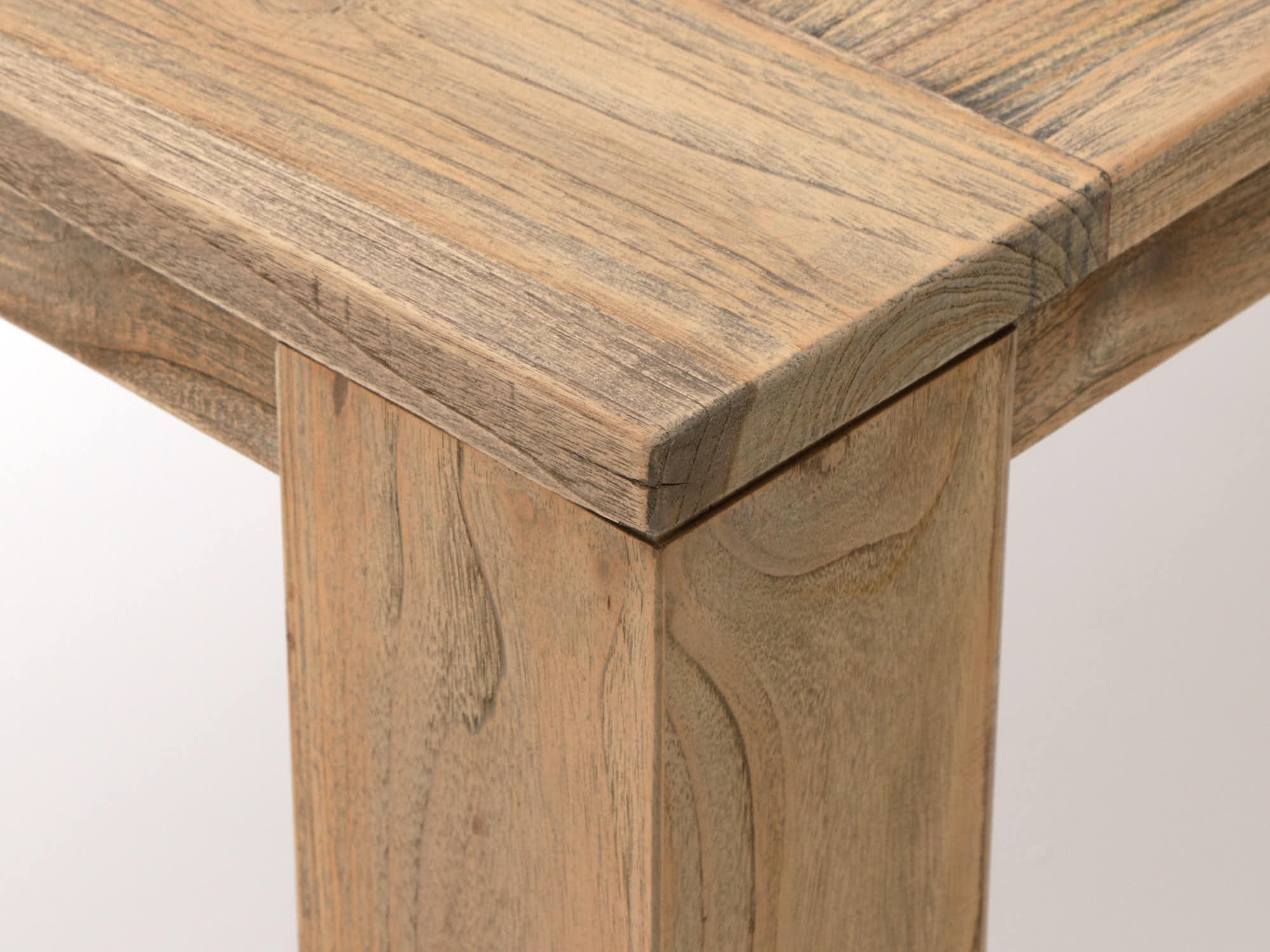 • Teakhouten tafel: Teakhout is een sterk natuurproduct dat tegen alle weersomstandigheden kan, dus je kunt de tafel gewoon buiten laten staan.