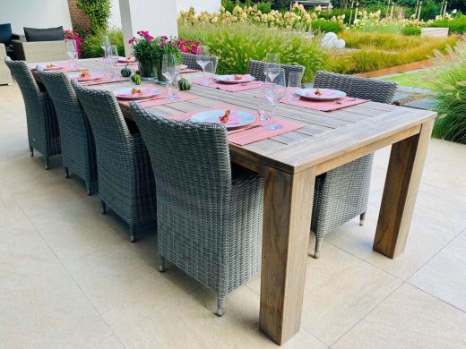 Teakhouten tafelblad: Het teakhout is bestand tegen alle weersomstandigheden en biedt een stevige constructie. Het is netjes afgewerkt zonder splinters, ideaal voor buitengebruik.