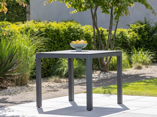 HPL tafelblad: Het tafelblad heeft een natuurlijke leisteenlook en is kras- en vlekbestendig, ideaal voor buitengebruik.