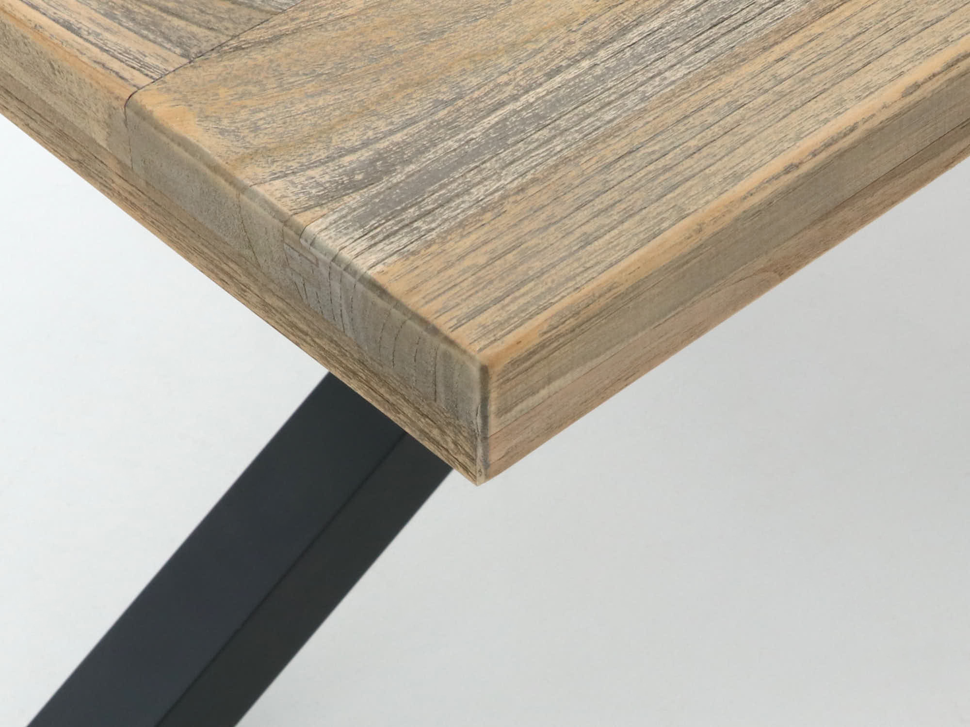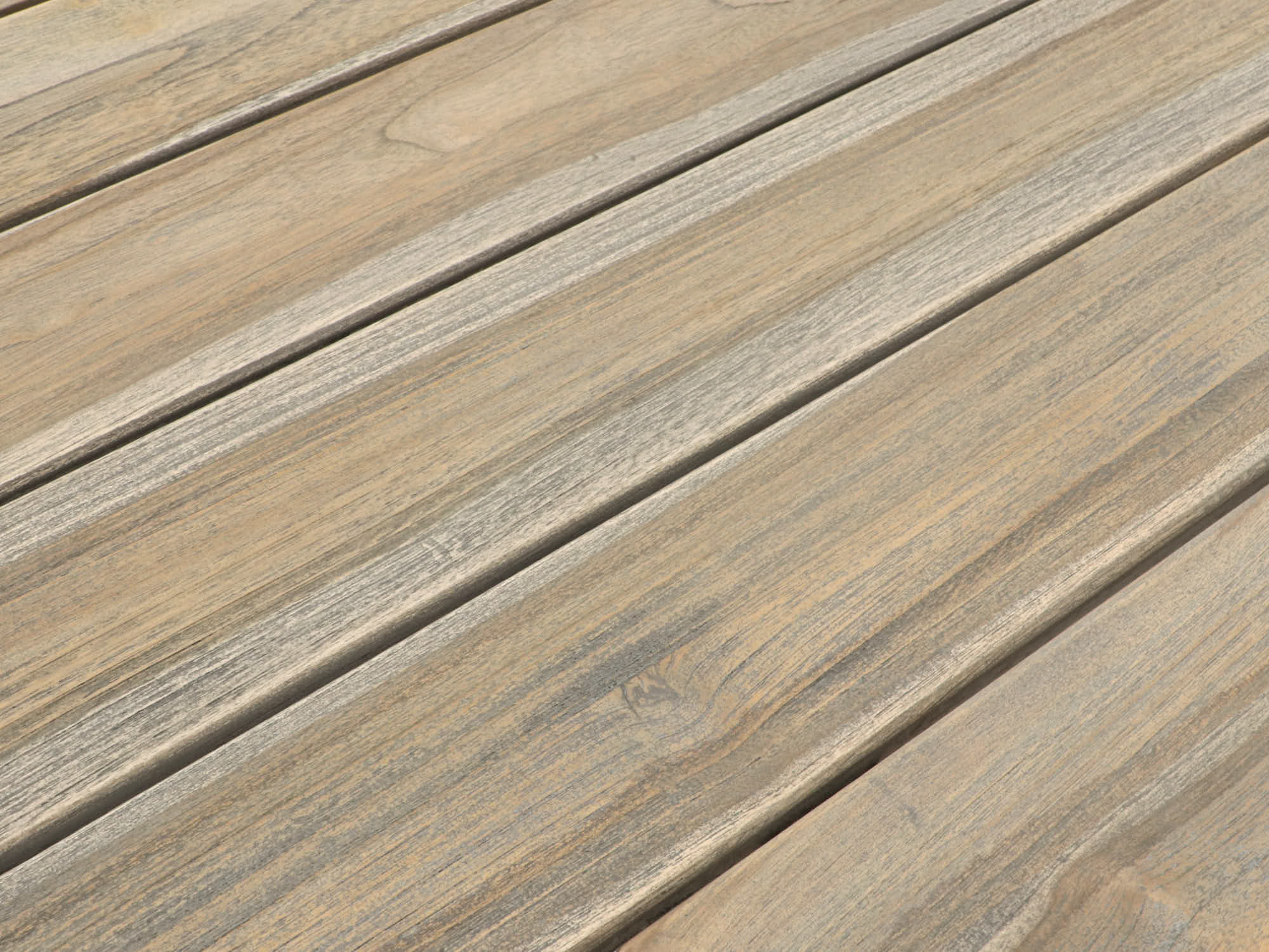 Teakhouten tafelblad: Het tafelblad is gemaakt van teakhout, dat bestand is tegen alle weersomstandigheden. Dit zorgt voor een stevige constructie en een natuurlijke uitstraling.