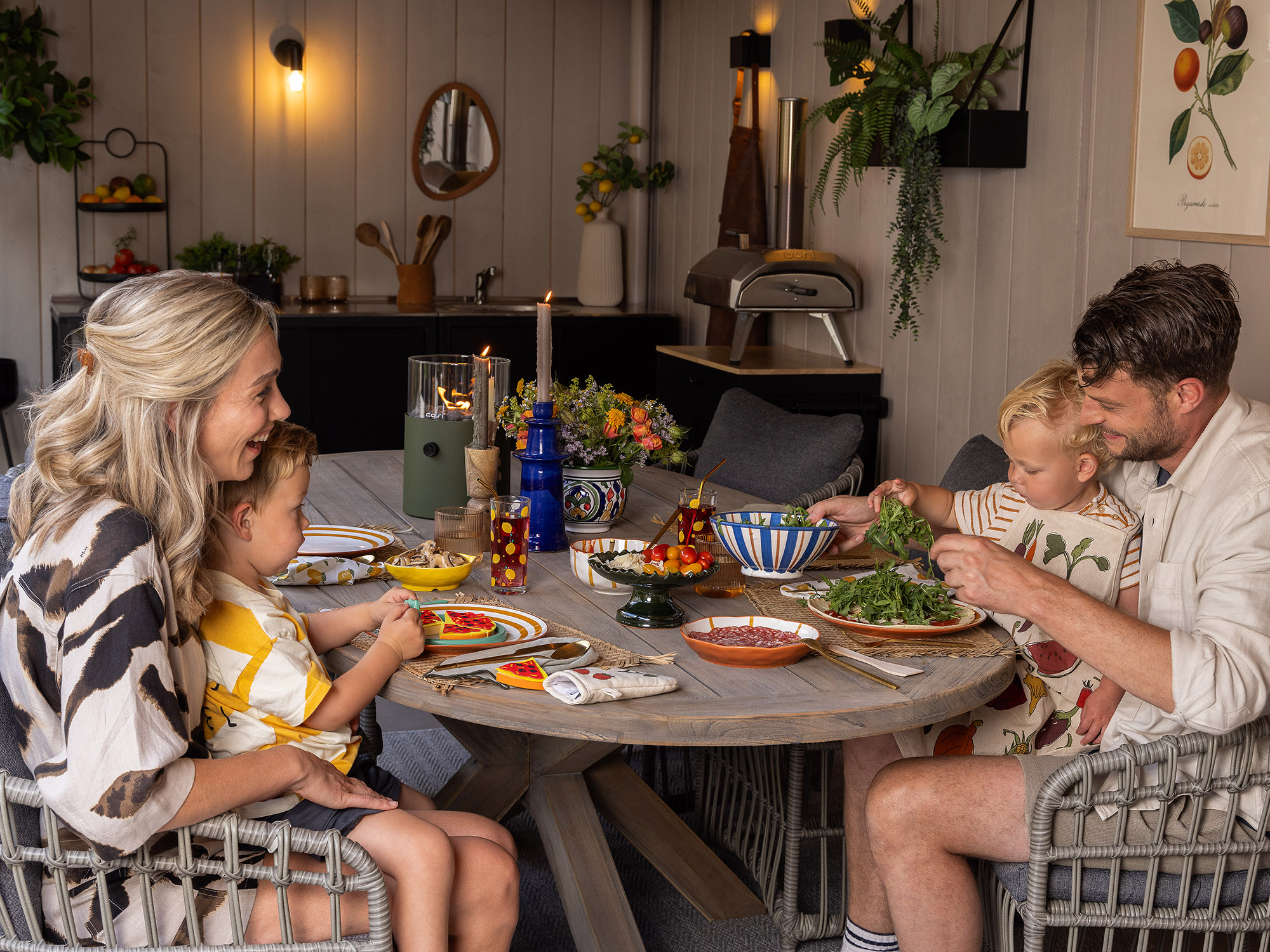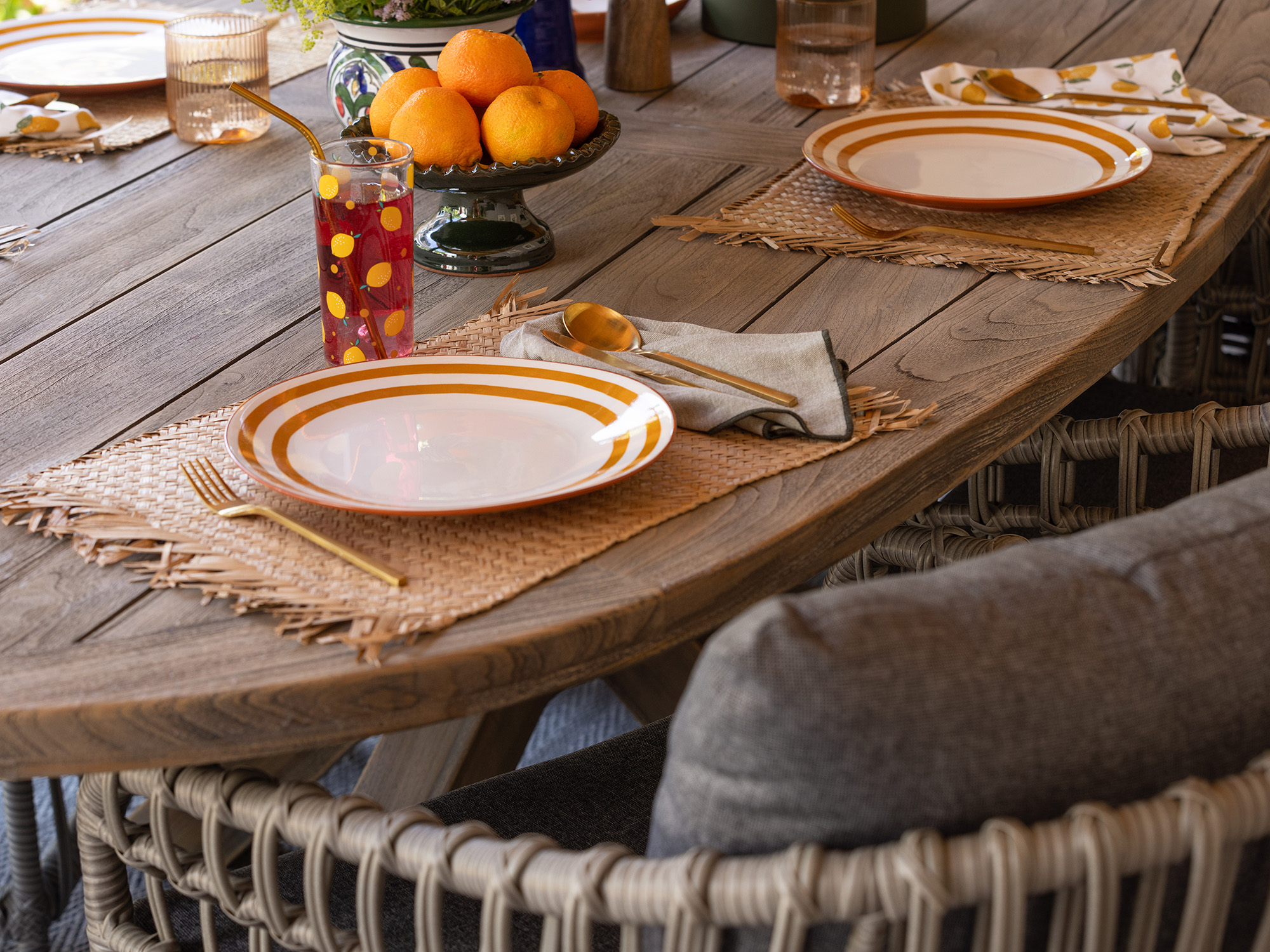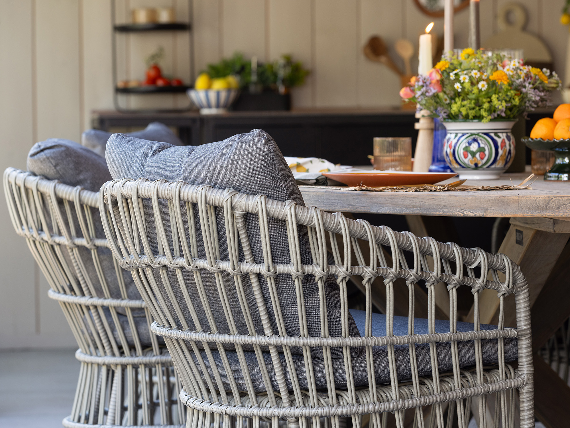 • Wicker stoelen met kussens: De stoelen zitten direct comfortabel, zodat je niet na een half uur weer naar binnen wilt.