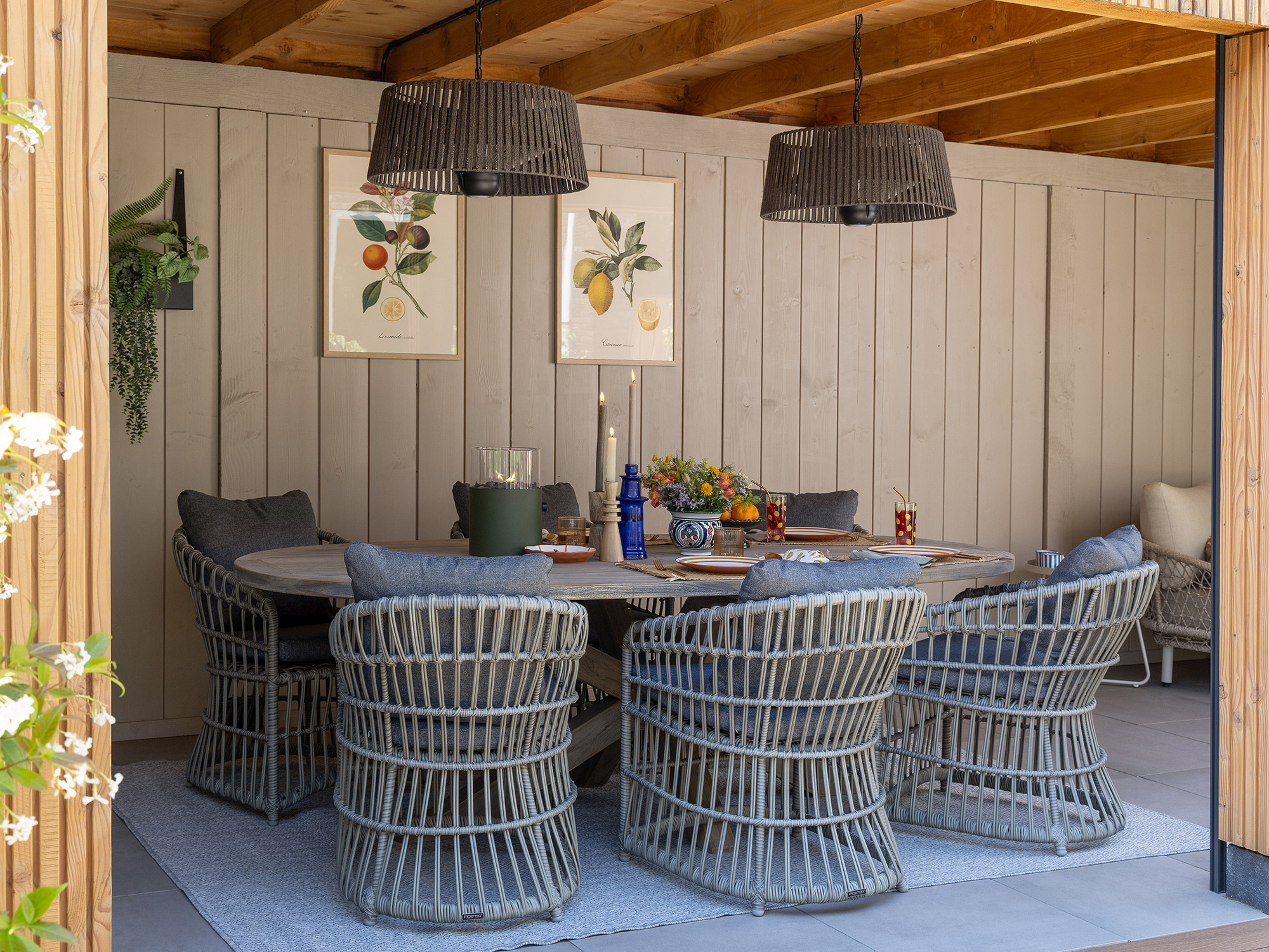 Handgevlochten wicker stoelen: Deze stoelen zijn strak afgewerkt en vochtbestendig, zodat ze netjes blijven zonder loshangende draden. En met de meegeleverde kussens zit je altijd comfortabel.