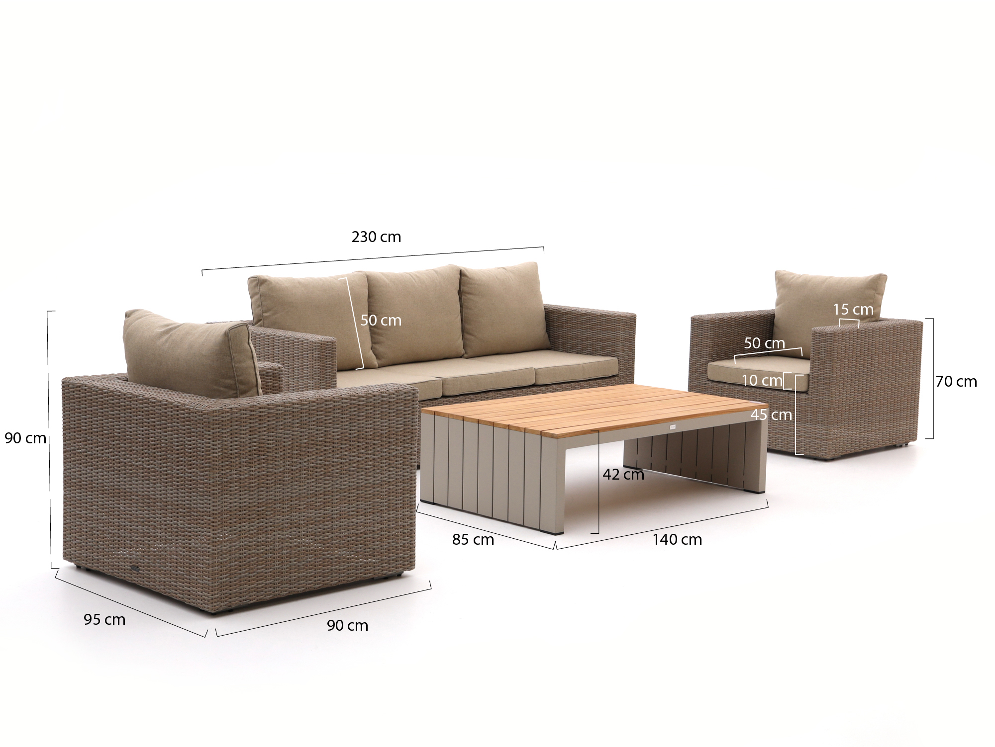 Deze loungeset is als een gezellige huiskamer voor buiten. Met plek voor vijf personen is het de ideale plek om met vrienden of familie te relaxen. De combinatie van wicker en teakhout geeft de set een warme uitstraling, terwijl het aluminium onderstel zorgt voor stevigheid. De kussens in zandkleur maken het plaatje compleet en zorgen voor extra comfort. Of je nu een boek leest of geniet van een drankje, deze set biedt je een comfortabele plek in de zon.