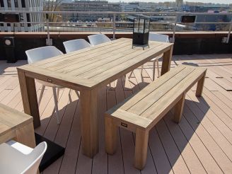 Teakhouten tafel: Het tafelblad en onderstel zijn gemaakt van teakhout, dat bekend staat om zijn duurzaamheid en weerbestendigheid. Dit betekent dat je tafel er zelfs na een regenbui nog steeds prachtig uitziet.