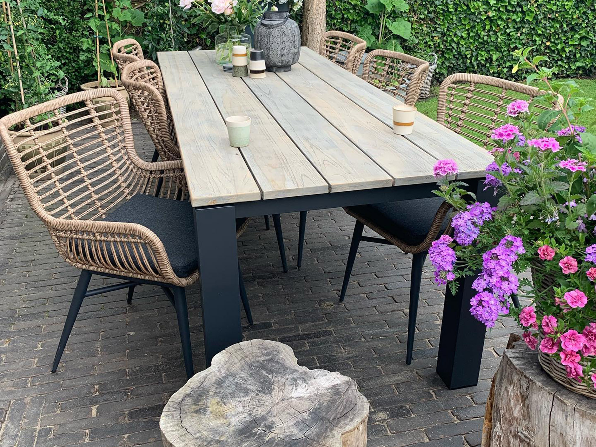 Teakhouten tafelblad: Het tafelblad van teakhout heeft een old teak greywash afwerking, wat het een robuuste en tijdloze uitstraling geeft.