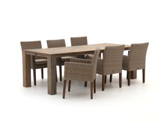 De Intenso Lesa/ROUGH X dining tuinset is een stevige eettafelset voor 6 personen, ideaal als je graag buiten eet met het gezin of vrienden. De combinatie van een lange teakhouten tafel van 240 cm met wicker stoelen met kussens zorgt dat je én de ruimte hebt én comfortabel zit tijdens het eten. Het teakhout van de tafel is een sterk natuurproduct dat tegen alle seizoenen kan, terwijl de extra strak gevlochten wicker zittingen netjes blijven zonder losse draden. De stoelen hebben comfortabele polyester kussens, zodat je niet na een half uur alweer naar binnen wilt. Dit is een logische keuze als je zoekt naar een degelijke, natuurlijke set om lang aan te tafelen, en niet zo bezig bent met schuiven en verplaatsen.