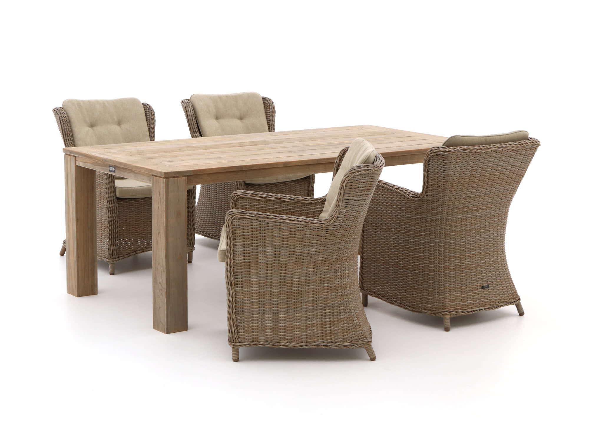 De Intenso Milano/ROUGH-X 200cm dining tuinset is een stijlvolle en praktische keuze voor jouw tuin. Deze 5-delige set combineert het natuurlijke gevoel van teakhout met het comfort van wicker stoelen, inclusief zachte zandkleurige kussens. Het teakhouten tafelblad is bestand tegen alle weersomstandigheden, waardoor je jarenlang plezier hebt zonder zorgen over onderhoud. De handgevlochten wicker stoelen zijn niet alleen vochtbestendig, maar ook licht van gewicht, waardoor je ze eenvoudig kunt verplaatsen. Deze set nodigt uit tot lange avonden tafelen in de buitenlucht. Tijd om die barbecue aan te steken en te genieten van een heerlijke maaltijd in je eigen tuinparadijs!
