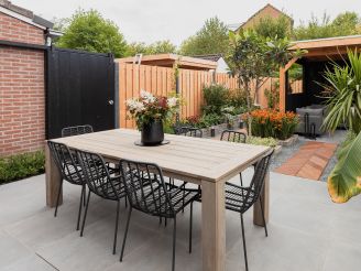 Teakhouten tafelblad: Dit duurzame materiaal is bestand tegen alle weersomstandigheden en zorgt voor jarenlang plezier zonder veel onderhoud. Perfect voor buitengebruik!