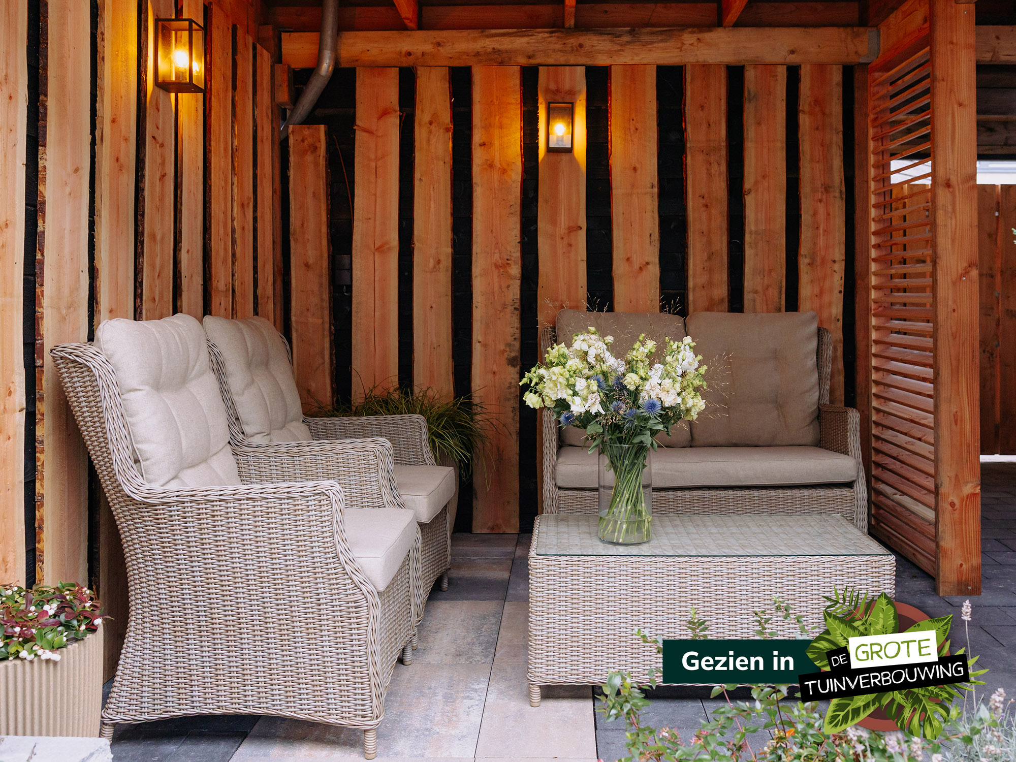 Inclusief kussens in Sand: De kussens bieden extra comfort en zijn uitgevoerd in een neutrale zandkleur die bij elke tuin past.