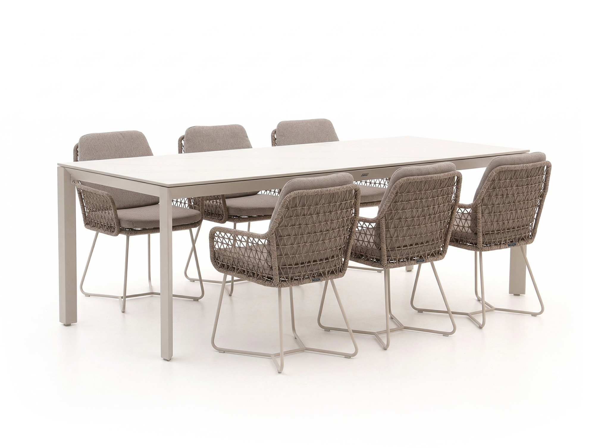 De Intenso Trasimeno/Sestino dining tuinset is een stevige 6 persoons eethoek voor als je graag buiten eet en natafelt met familie of vrienden. De stoelen zijn uitgevoerd met rope in een beige zandkleur met bijpassende kussens, wat zacht zit en er modern uitziet. Het sintered stone tafelblad in wit geeft een rustige, strakke basis waar je borden en pannen gewoon op kunt zetten zonder snel bang te zijn voor krassen of hitte. Deze set past goed als je een vaste plek op je terras hebt voor een eettafel en je liever comfortabel blijft zitten dan steeds heen en weer loopt met losse stoelen.
