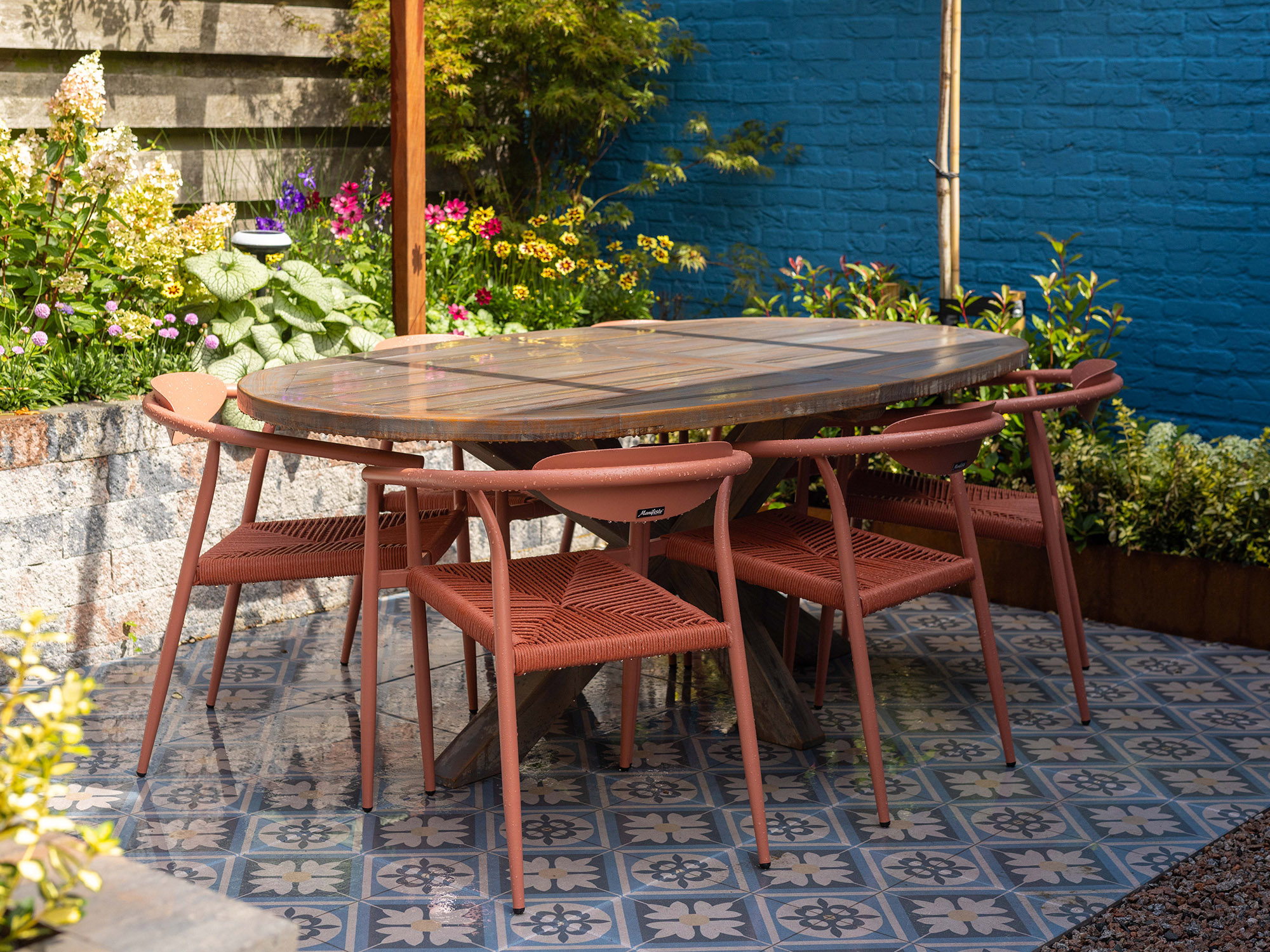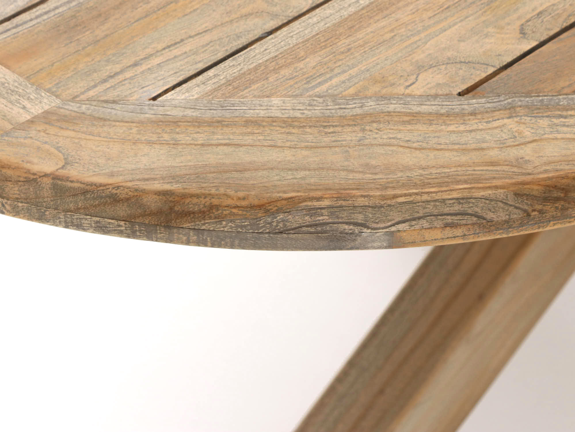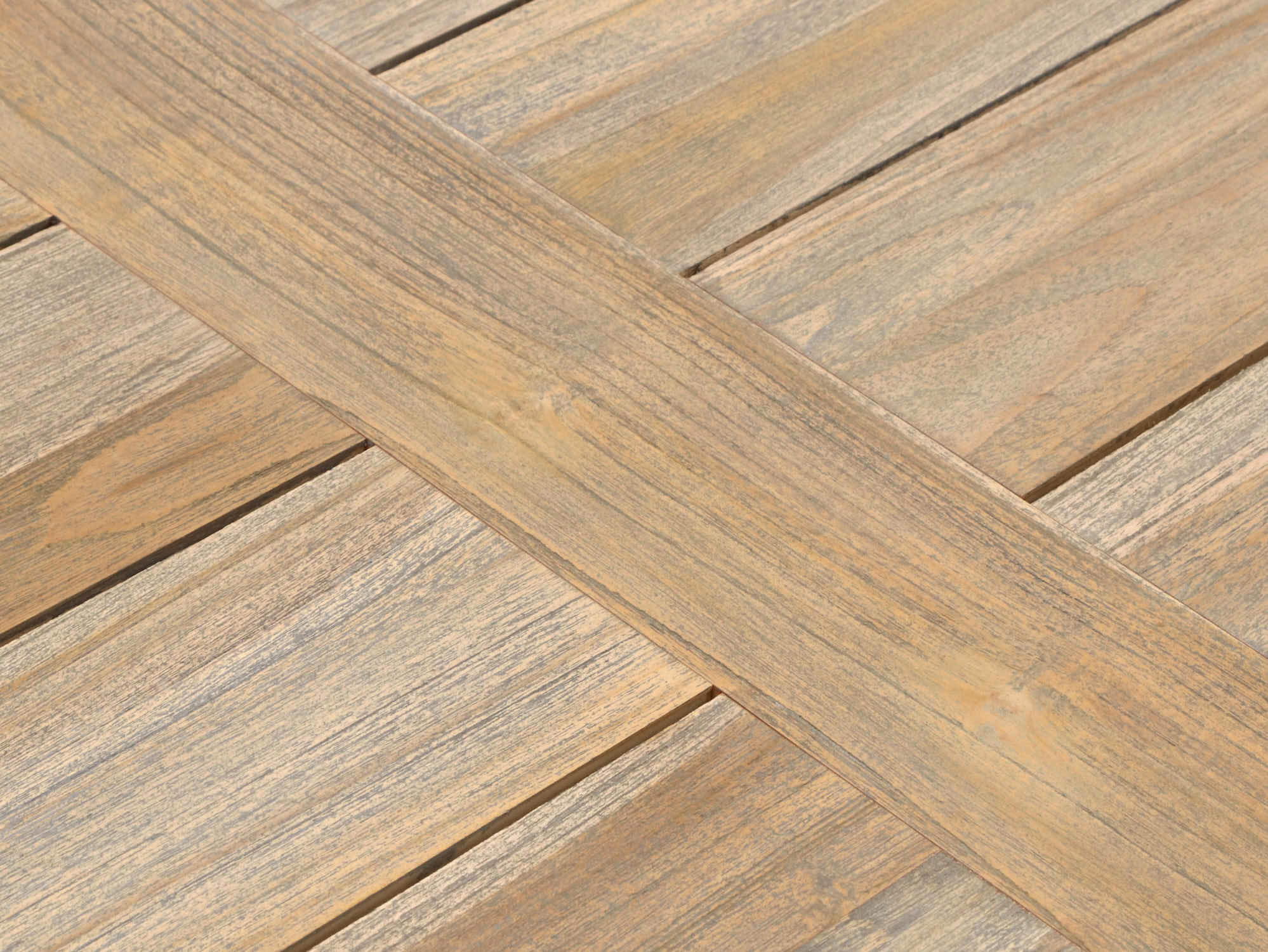 Teakhouten tafelblad: Dit hout is zorgvuldig gedroogd, waardoor het minder snel scheurt of kromtrekt. Het is bestand tegen alle weersomstandigheden, dus je kunt er jarenlang van genieten.