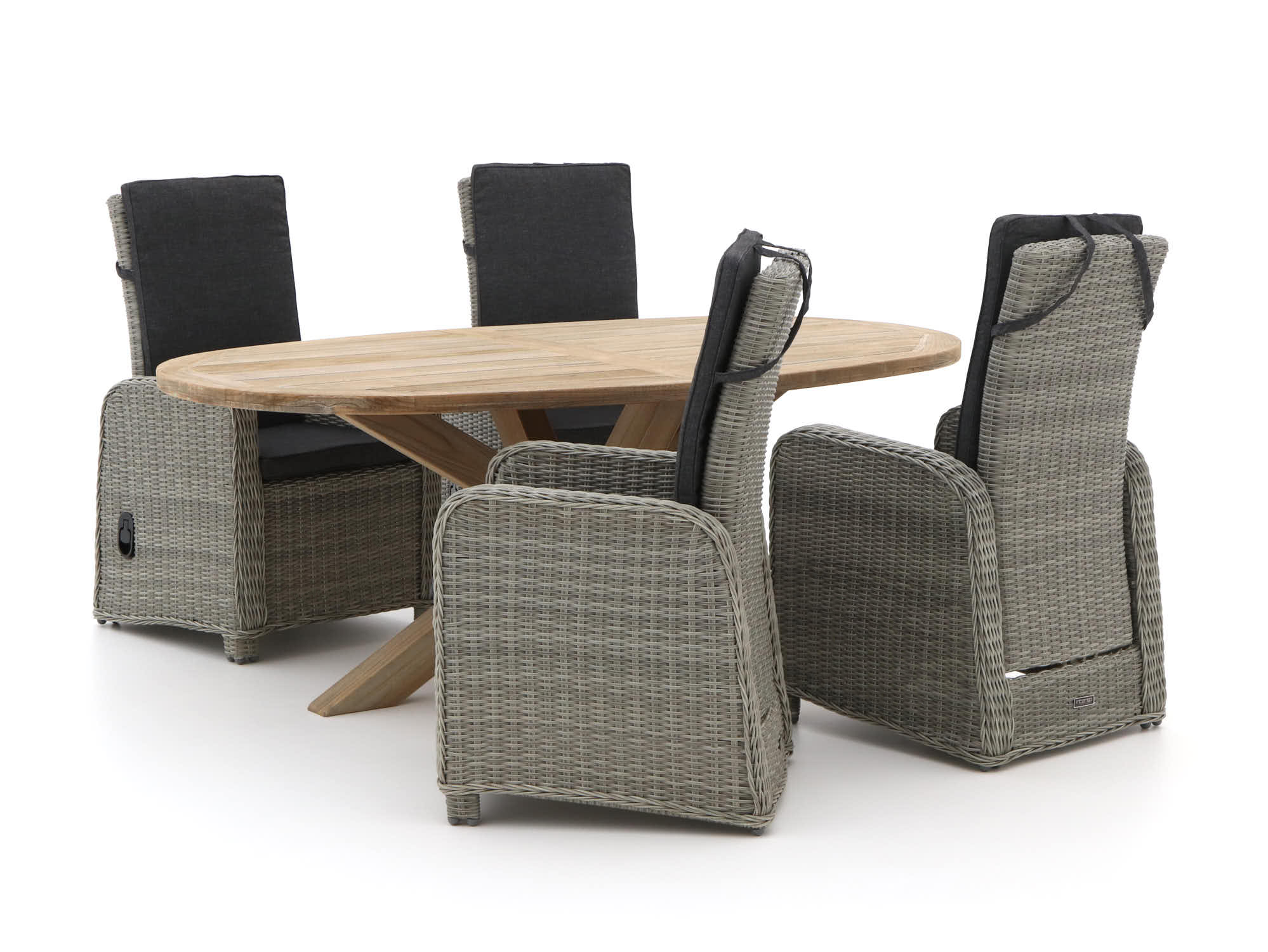Met de Intenso Umbria/ROUGH-Y Ellips dining tuinset haal je een stukje comfort en stijl naar je tuin. Deze 5-delige set in een elegante antracietkleur biedt plek voor vier personen en is ideaal voor lange zomeravonden vol gezelligheid. De verstelbare stoelen zijn bekleed met handgevlochten wicker, wat niet alleen een luxe uitstraling geeft, maar ook vochtbestendig is. Het teakhouten tafelblad is bestand tegen alle weersomstandigheden en zorgt voor een warme, natuurlijke touch. Dankzij de ovale vorm van de tafel hoef je je geen zorgen te maken over scherpe hoeken – ideaal voor een ontspannen sfeer.