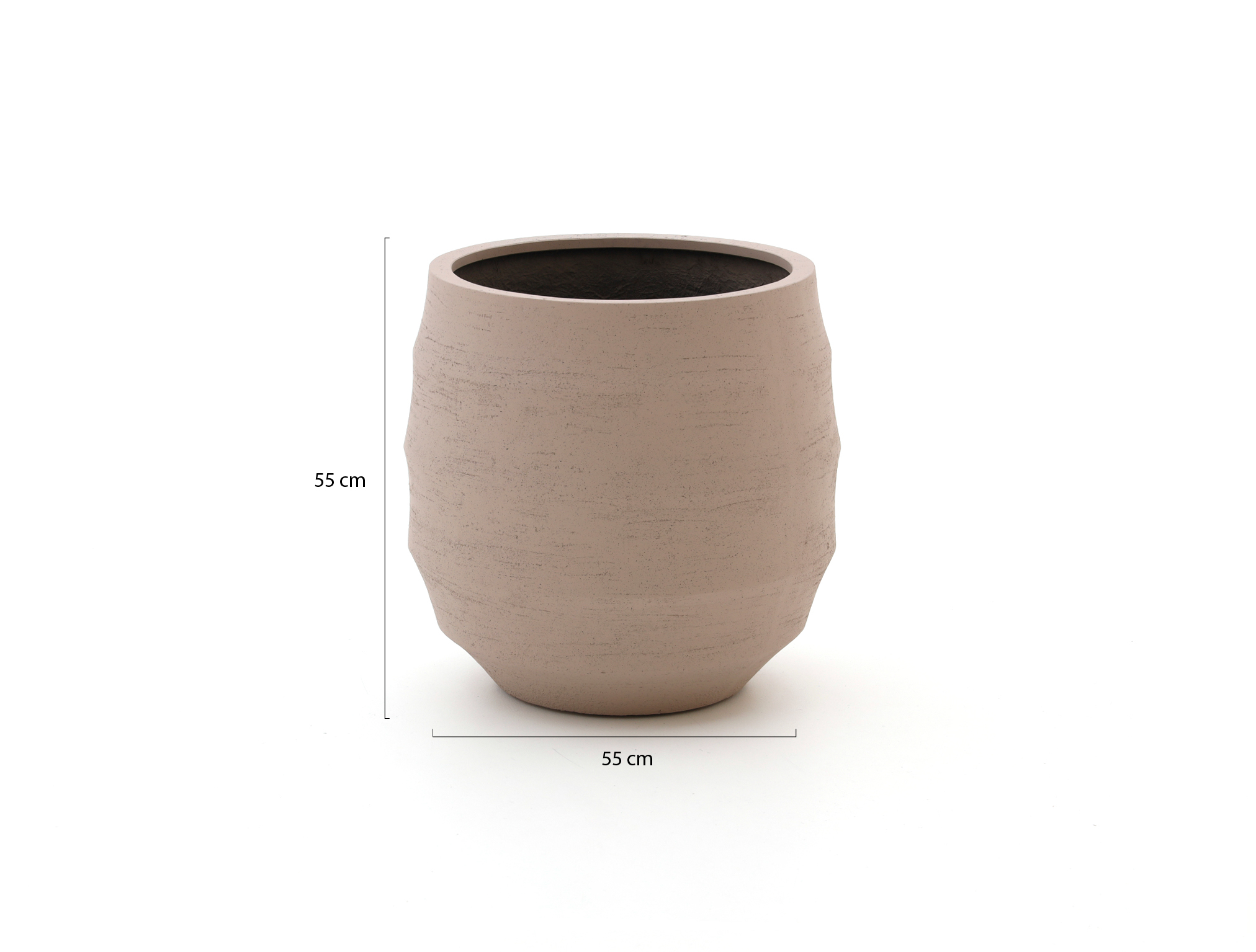 Met een buitendiameter van 55 cm en een inhoud van 90 liter is dit een flinke bloempot, geschikt voor grote kunstplanten of royale beplanting. De binnenhoogte van 52,5 cm geeft genoeg diepte voor wortels of voor het mooi plaatsen van een kunstplant. Door de zandkleur combineer je deze pot makkelijk met andere kleuren tuinmeubelen en accessoires. Handig als je een grote, rustige blikvanger zoekt, maar minder geschikt als je eigenlijk weinig ruimte hebt of de pot gevuld toch nog vaak wilt verplaatsen.