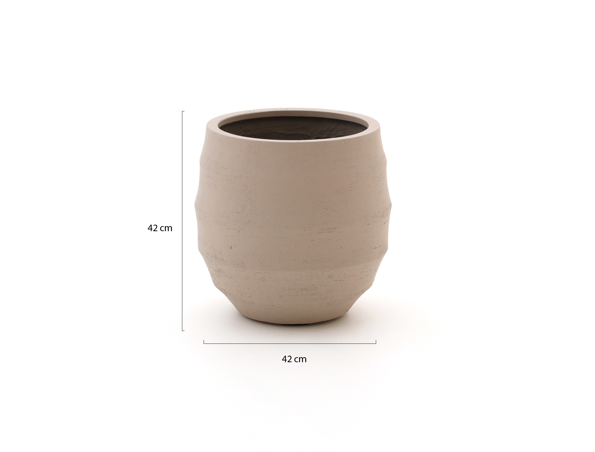 Met een buitenmaat van 42 bij 42 cm en een hoogte van 42 cm heb je genoeg inhoud (40 liter) voor een flinke plant, zonder dat de pot log oogt. De binnenmaat en opening (ongeveer 31,5 cm boven en 39,5 cm diep) geven ruimte aan een volle kunstplant of een echte plant met inzethoes. De pot heeft een of meer afwateringsgaten en een meegeleverde plug, handig tegen stilstaand water, al is hij daardoor niet helemaal waterdicht. Binnen met echte beplanting gebruik je altijd een inzethoes; deze pot is vooral handig als je een zorgeloze, stevige pot zoekt die het hele jaar door kan blijven staan.