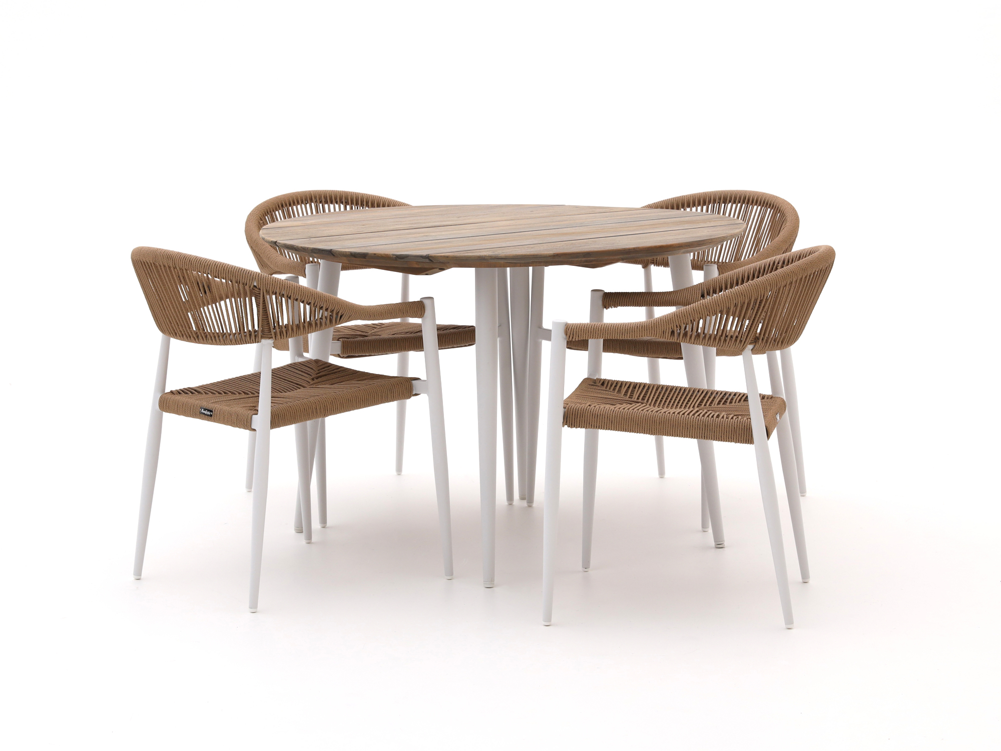 De Manifesto Belpasso/Falcade dining tuinset is als een goede vriend die altijd klaarstaat voor een gezellige avond in de tuin. Met zijn ronde tafel van 115 cm doorsnee en vier comfortabele stoelen, biedt deze set precies de juiste plek voor een ontspannen diner onder de sterren. De combinatie van natuurlijk ogend vlechtwerk en een tafelblad van Old Teak Greywash geeft een warme, uitnodigende uitstraling. En dankzij het stapelbare ontwerp van de stoelen, is opruimen na een gezellige avond een fluitje van een cent. Dus, zet de kaarsen aan, schenk een glas in en geniet van het buitenleven op zijn best.