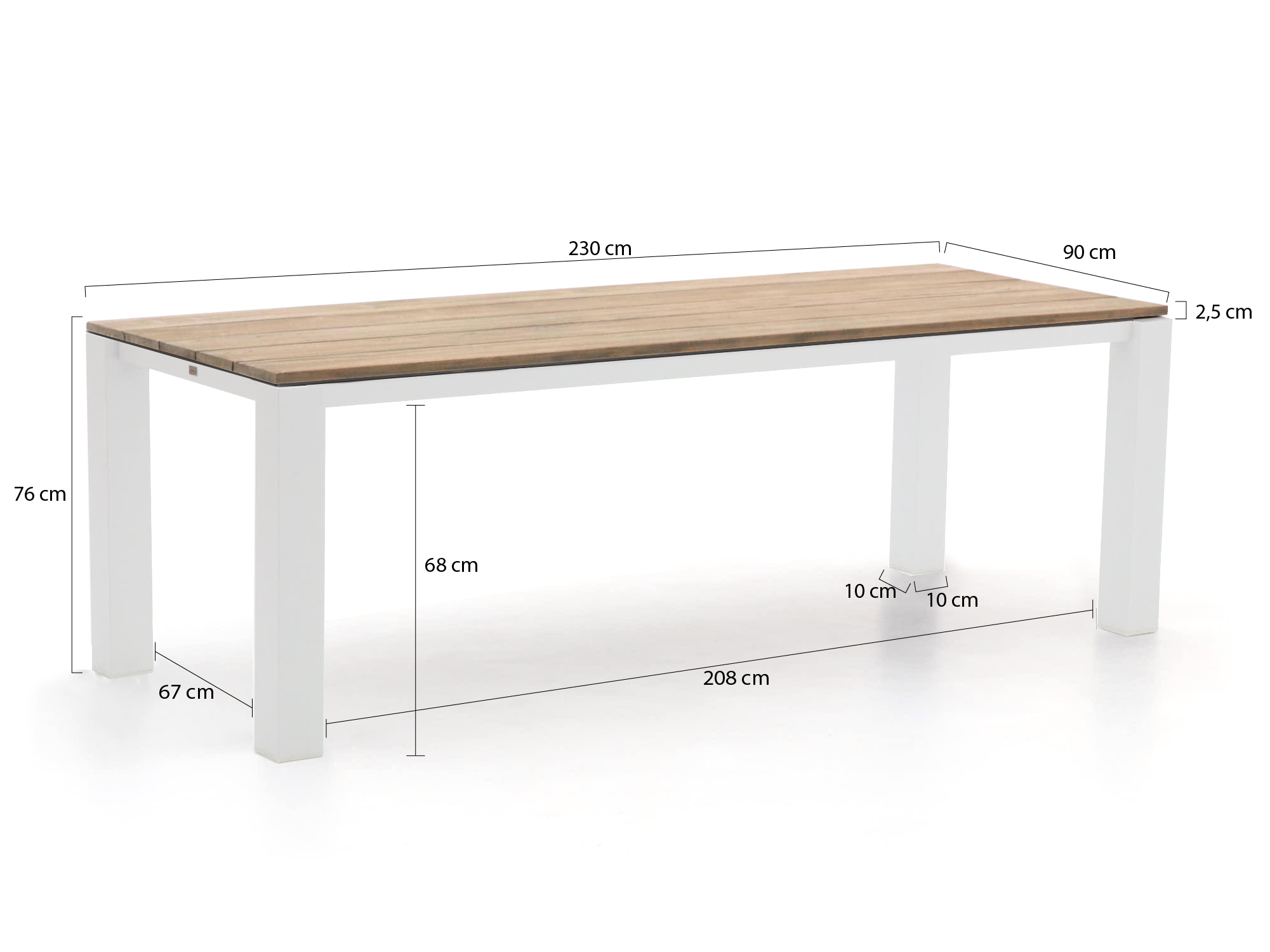 Materiaal tafelblad: Het teakhouten tafelblad voegt een warme en natuurlijke touch toe aan de set. Teakhout staat bekend om zijn duurzaamheid en weerbestendigheid, waardoor het perfect is voor gebruik buitenshuis. Het vergrijst mooi in de loop der tijd, wat bijdraagt aan de charme van je tuinmeubelen.