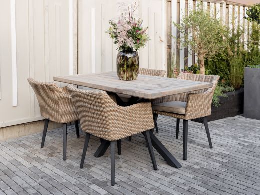 De Manifesto Matese/Montorio dining tuinset is een stijlvolle aanvulling voor elke tuin. Deze 5-delige set combineert een robuuste uitstraling met praktisch gebruiksgemak. Het tafelblad van Old Teak Greywash geeft een natuurlijke en tijdloze uitstraling, terwijl het aluminium onderstel zorgt voor een stevige basis die niet doorroest. De handgevlochten wicker stoelen zijn niet alleen vochtbestendig, maar ook licht van gewicht, waardoor je ze eenvoudig kunt verplaatsen. Met de comfortabele kussens in de kleur Sand is het heerlijk vertoeven aan deze tafel. Geniet van lange zomeravonden met vrienden en familie aan deze uitnodigende tuinset. En zeg nou zelf, een beetje gezelligheid in de tuin kan nooit kwaad, toch?