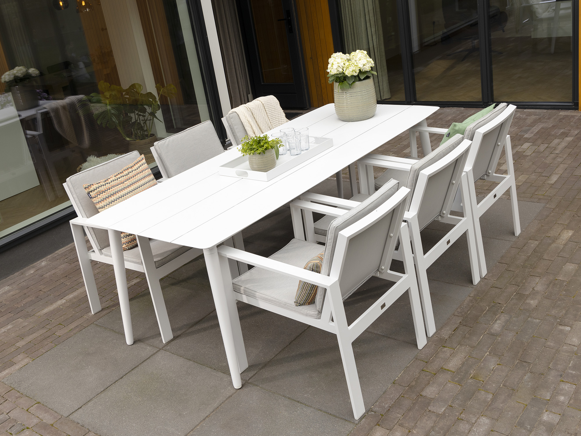 Materiaal stoelframe: Ook het stoelframe is gemaakt van aluminium, wat zorgt voor een sterke en duurzame constructie. Dit materiaal vereist weinig onderhoud en is ideaal voor buitengebruik.
