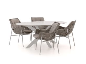 Deze Manifesto Novara/Furato dining tuinset is een fijne plek voor een gezellige maaltijd in de tuin. Met plek voor vier personen en een ovaal tafelblad van sintered stone in een frisse witte kleur, is het een echte blikvanger. De stoelen zijn gemaakt van handgevlochten wicker in een grijze tint, wat niet alleen uniek oogt, maar ook bestand is tegen een regenbuitje. Het aluminium frame zorgt ervoor dat je je geen zorgen hoeft te maken over roest. Kortom, een praktische en stijlvolle keuze voor je tuin.