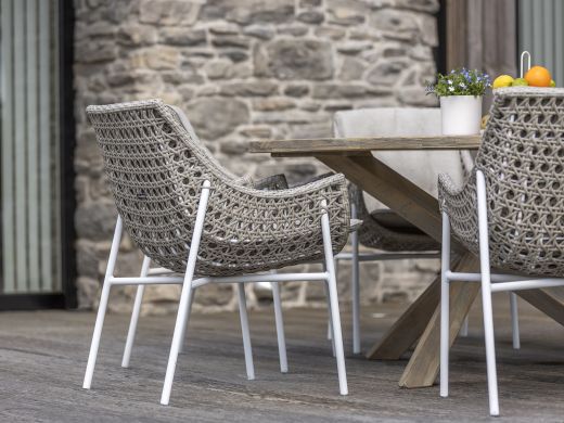 Geniet van heerlijke zomerdagen met de Manifesto Novara/Furato dining tuinset! Deze 7-delige set is een echte blikvanger in je tuin dankzij het elegante witte frame en de neutrale tinten van de kussens. De stoelen zijn gemaakt van handgevlochten wicker, wat niet alleen uniek is, maar ook vochtbestendig en duurzaam. Het tafelblad van sintered stone is bestand tegen krassen en vlekken, ideaal voor gezellige diners zonder zorgen. Met deze set creëer je een stijlvolle en comfortabele plek om samen te komen met vrienden en familie. En zeg nou zelf, wie wil er nou niet zo'n fijne plek in de tuin?