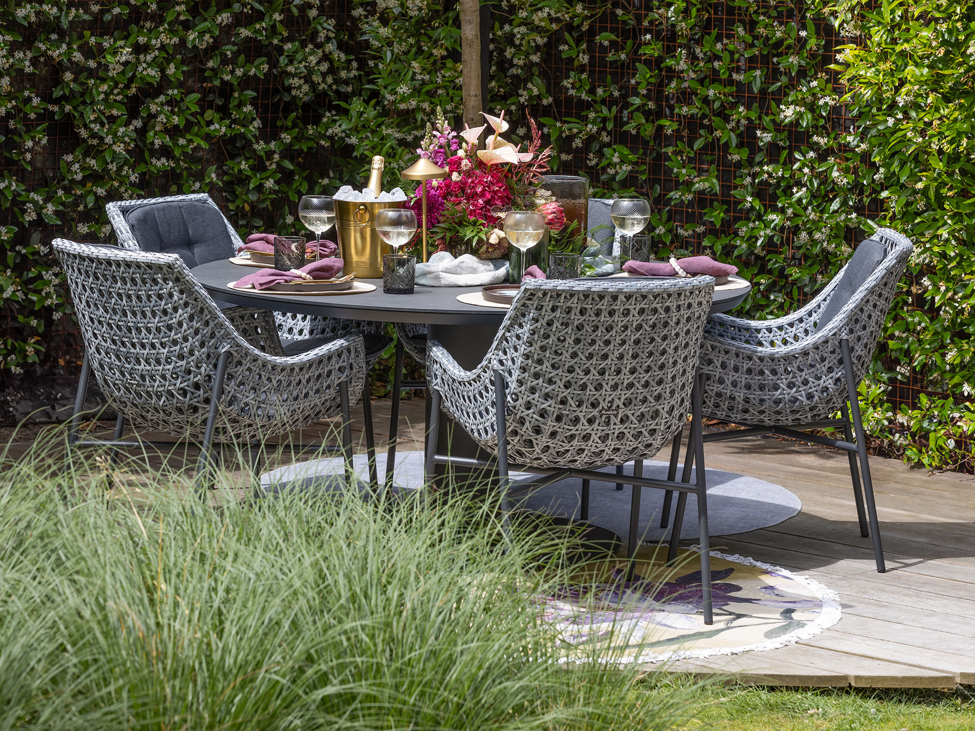 De Manifesto Novara/Furato dining tuinset is een fantastische keuze voor wie houdt van stijlvol en praktisch buitenleven. Deze 7-delige set biedt plaats aan zes personen en is perfect voor gezellige etentjes in de tuin. Het aluminium frame van zowel de tafel als de stoelen is onderhoudsarm en kan niet doorroesten, ideaal voor buitengebruik. De stoelen zijn voorzien van handgevlochten wicker, wat niet alleen vochtbestendig is, maar ook zorgt voor een unieke uitstraling. Met de bijgeleverde kussens geniet je van extra zitcomfort, zodat je urenlang kunt tafelen. Dus, nodig je vrienden uit en geniet van een heerlijke maaltijd in de buitenlucht – deze set is er helemaal klaar voor!