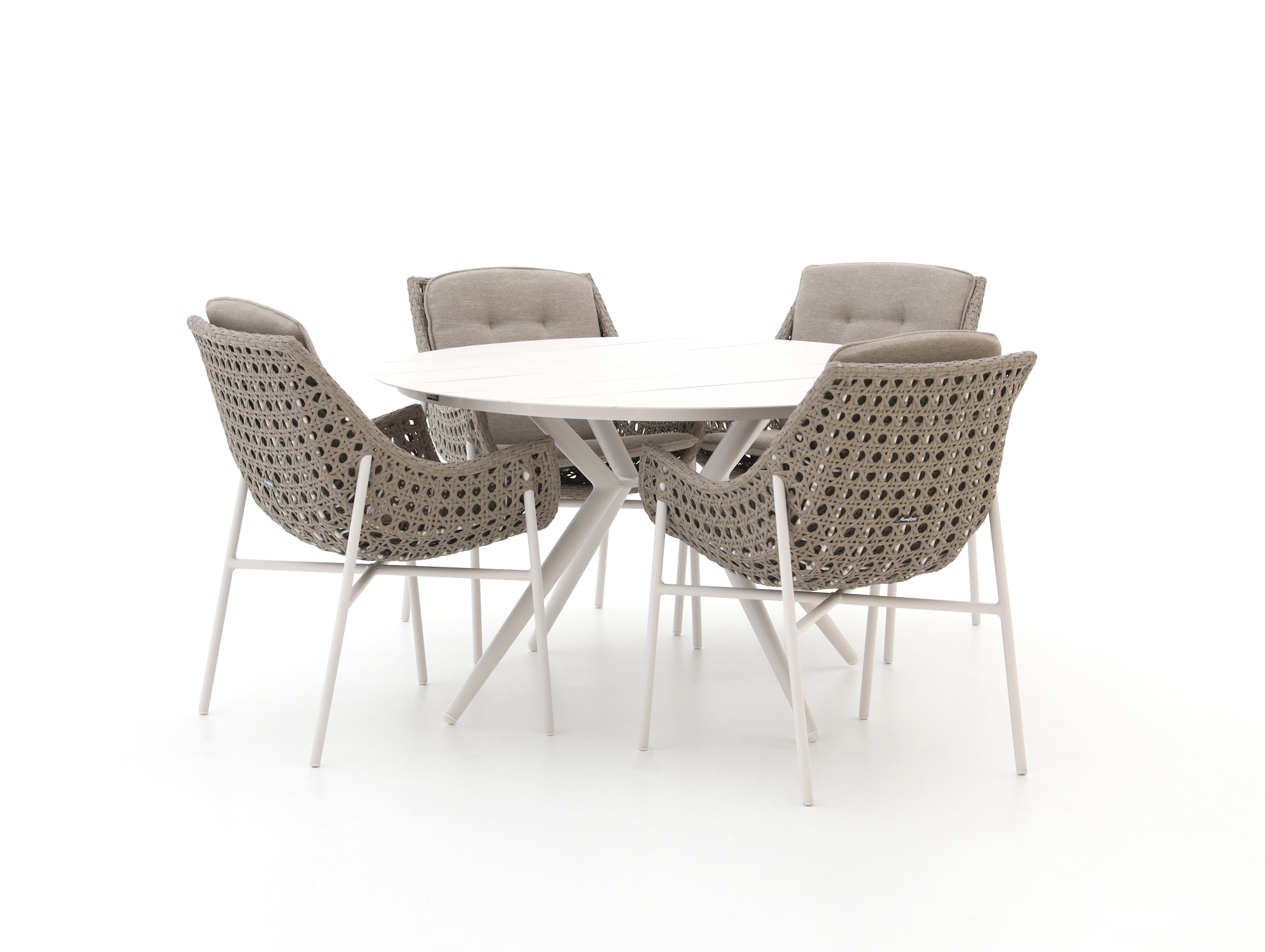 Een ronde tafel brengt mensen bij elkaar, simpel en gezellig. Met de Manifesto Novara/Sora dining tuinset zit je met z’n vieren ruim aan een witte tafel van 127 cm. De kuipstoelen met gevlochten zitting geven fijne steun en zitten luchtig; met de meegeleverde kussens wordt het lekker lang natafelen. De rustige mix van wit, grijs en beige past moeiteloos bij hout, natuursteen of tegels. Door de ronde vorm heeft iedereen evenveel plek en blijf je makkelijk in gesprek. Aluminium frames en tafelblad kunnen niet roesten en zijn zo weer schoon te vegen. Compact genoeg voor het terras, groot genoeg voor ontbijt, spelletjes en een schaal salades.