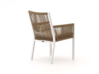 De Manifesto Rivola dining tuinstoel wit is een fijne tuinstoel als je graag lang aan tafel zit, zonder dat je terras meteen vol oogt. De combinatie van een aluminium frame met rope zitting en een beige zitkussen geeft je een stevige, maar toch licht verende zit. Aluminium is licht van gewicht, roest niet en heeft weinig onderhoud nodig, waardoor je de stoel makkelijk verschuift en hij prima buiten kan blijven staan. Het rope in de zitting vormt zich licht naar je lichaam en droogt snel op na een regenbui, zodat je niet lang hoeft te wachten om weer te gaan zitten.
