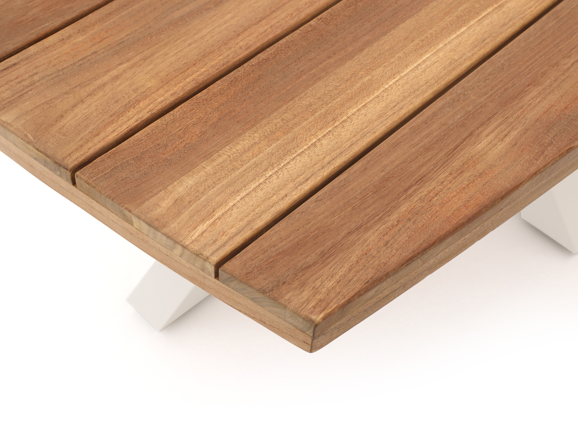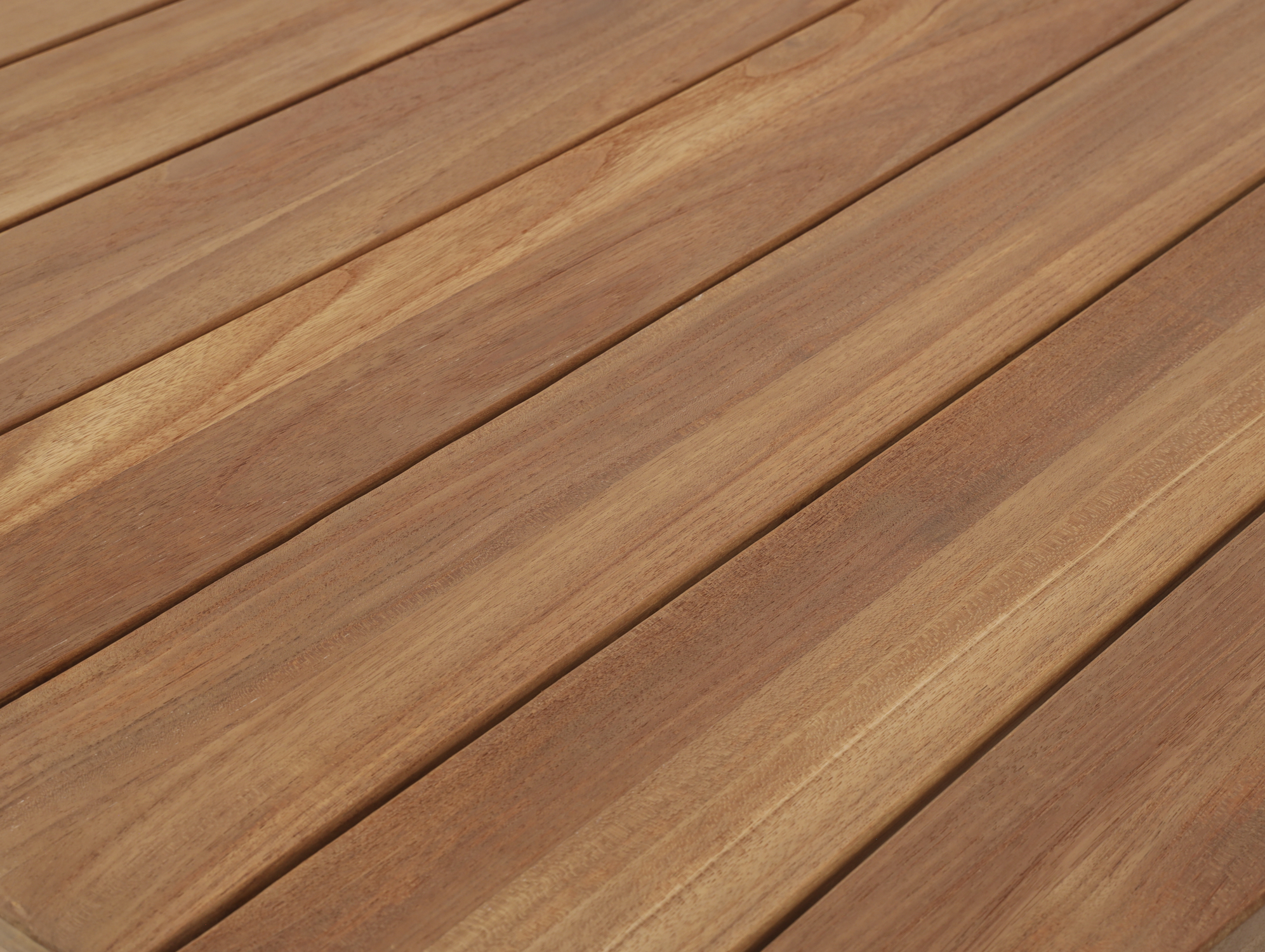 • Teakhouten tafelblad: Dit sterke natuurhout kan tegen weer en wind, zodat je het hele seizoen door gewoon buiten kunt laten staan.