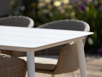 Om je diningset zo lang mogelijk mooi te houden, adviseren wij om een beschermende laag aan te brengen met onze Kees Smit Multi-surface beschermer. Deze beschermer stoot water en vuil af, waardoor je tuinset langer schoon en mooi blijft. Is je diningset vies geworden? Neem deze dan af met een doek en wat groene zeep. Ons advies is om je aluminium en wicker diningset minstens twee keer per jaar grondig schoon te maken. Voor het beste resultaat gebruik je dan onze Kees Smit Multi-surface reiniger voor het aluminium frame en tafelblad, en de Kees Smit Multi-surface reiniger voor de wicker zitting. Deze zijn eenvoudig in gebruik, en laten je diningset er weer als nieuw uitzien. Vermijd het gebruik van een hogedrukreiniger, want dit kan het materiaal beschadigen.