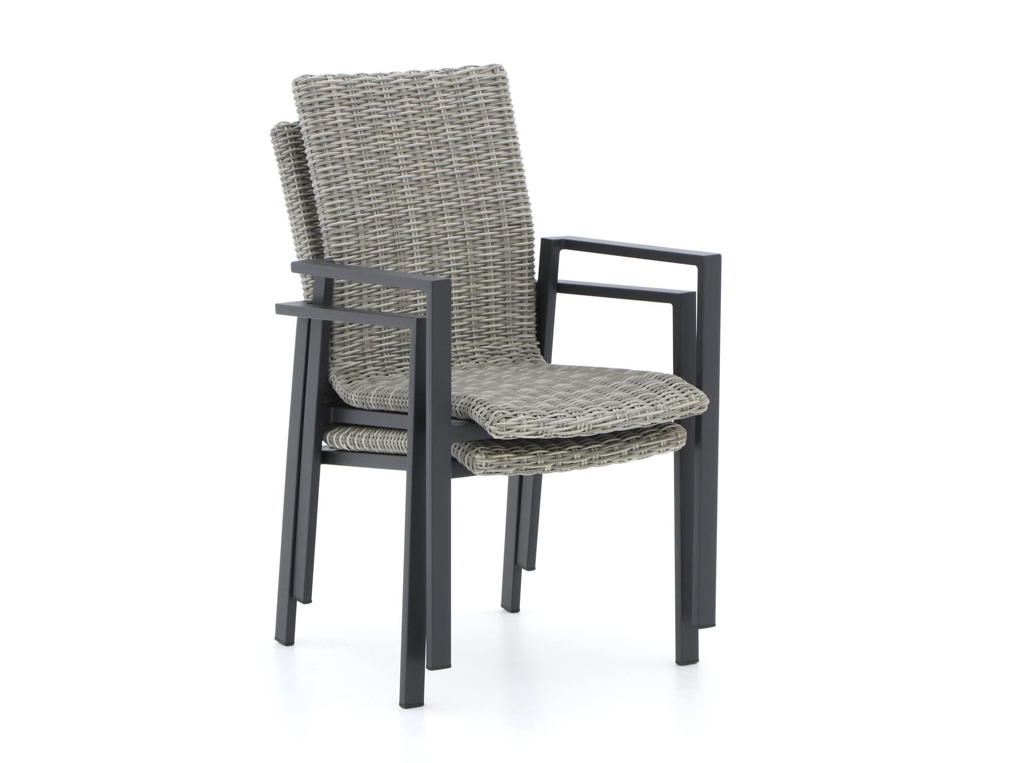 Stapelbare stoelen: De stoelen zijn stapelbaar, wat betekent dat je ze makkelijk kunt opbergen als je wat extra ruimte nodig hebt. Handig voor als je onverwachts een dansvloer wilt creëren op je terras.