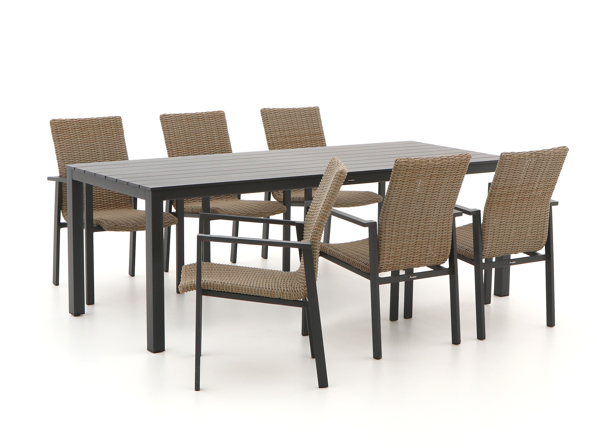 Met de Manifesto Villongo/Menzano 220cm dining tuinset haal je een stukje luxe en comfort naar je tuin. Deze 7-delige set, bestaande uit een ruime tafel en zes stapelbare stoelen, is ideaal voor lange zomerse avonden met vrienden of familie. Het vlechtwerk van de stoelen zorgt niet alleen voor een stijlvolle uitstraling, maar biedt ook een comfortabele zitervaring. En dankzij het stevige aluminium frame hoef je je geen zorgen te maken over roest of onderhoud. De antracietkleurige afwerking geeft de set een moderne en tijdloze look, die in elke tuin tot zijn recht komt. Of je nu een barbecue organiseert of gewoon geniet van een kopje koffie in de ochtendzon, deze tuinset maakt elke gelegenheid bijzonder.