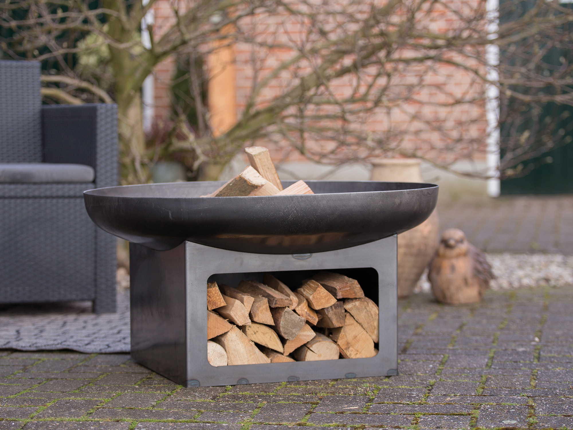 Handige houtopslag: houtblokken bewaar je direct onder de schaal, klaar voor gebruik