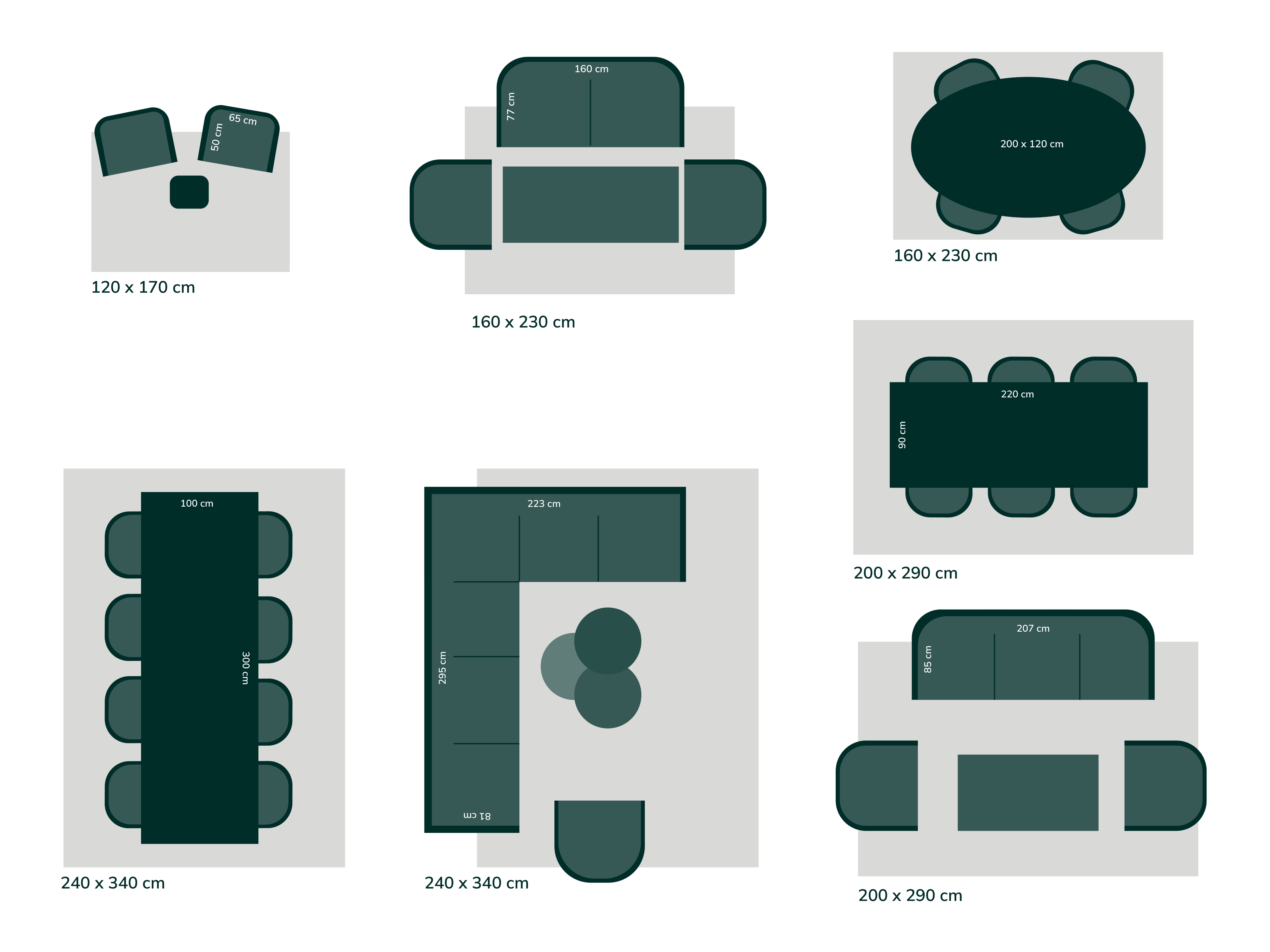 Bij een diningset: Zorg dat de hele set op het kleed past, ook als de stoelen naar achter worden geschoven. Reken ongeveer 40 cm extra rondom, dan zit je goed.